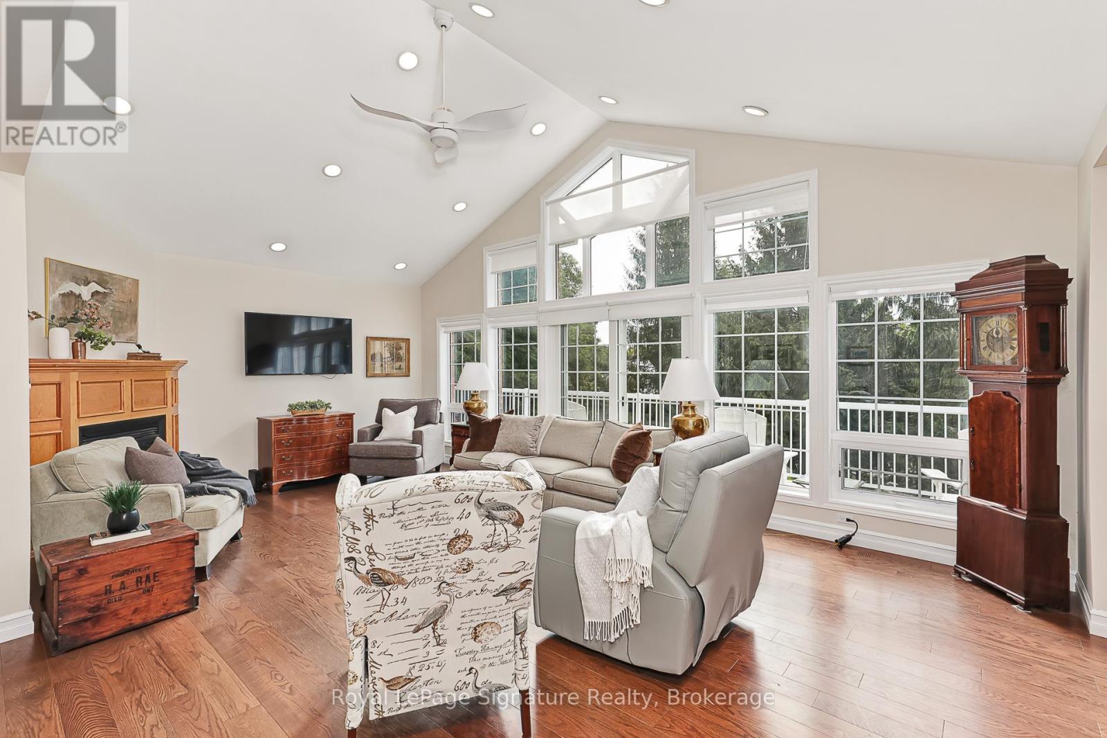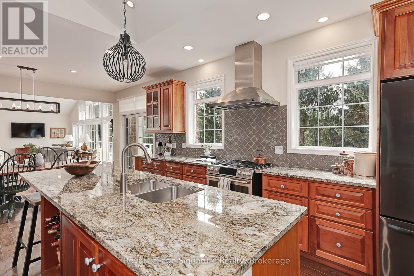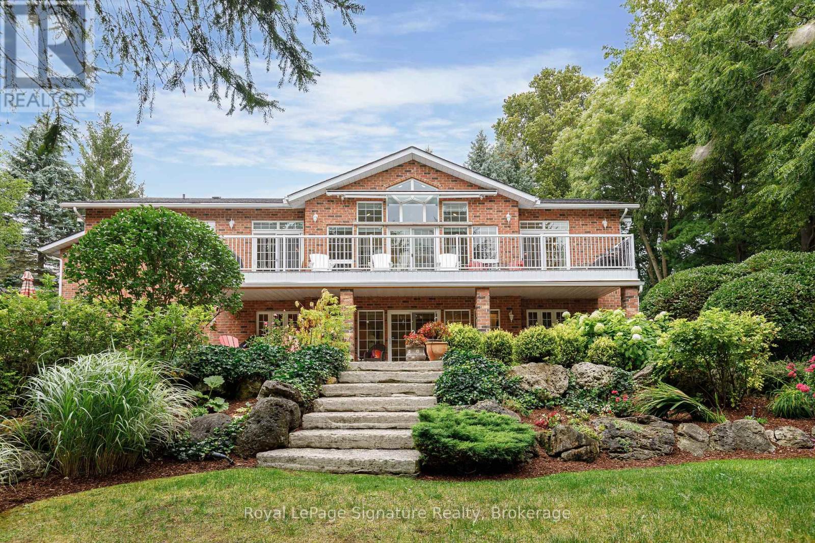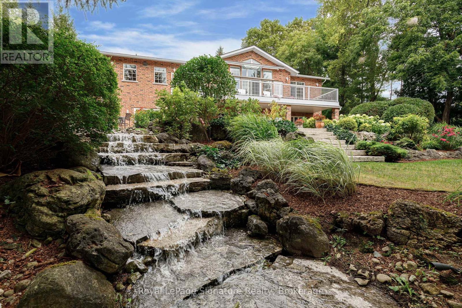 Welcome to 180 Russell, an exceptional brick residence that blends privacy, elegance, and outstanding outdoor living. Set on a rolling, professionally landscaped lot, the property is framed by stone walkways, soldier stone detailing along the driveway, and a stamped concrete entry, creating striking curb appeal from the moment you arrive. Designed for year-round enjoyment, the backyard is a true retreat, featuring a tranquil waterfall, outdoor fireplace, expansive deck, covered patios, and a walk-out lower level-perfect for effortless entertaining and relaxed outdoor living. Inside, the main level offers a bright, open-concept layout where the kitchen, dining, and living areas flow seamlessly together. Large sliding doors extend the living space to a generous deck overlooking the private, serene yard. The primary suite is a private haven with his-and-hers closets and a spa-inspired ensuite with heated floors. A flexible office or den, a full bathroom, convenient laundry, and direct garage access complete the main floor. The fully finished lower level is ideal for hosting and extended family, featuring a spacious family room with gas fireplace, three additional bedrooms, a full bath, and a two-piece bath. Radiant in-floor heating ensures year-round comfort, while the thoughtfully designed second kitchen-equipped with a cooktop, sink, dishwasher, bar fridge, and beverage fridge-enhances both indoor and outdoor entertaining. With its own walk-outs, bedrooms, bathrooms, and kitchen, this level also offers excellent potential for a private in-law suite.Additional highlights include a covered front porch, a two-car garage with inside entry, beautifully curated landscaping, and a Wi-Fi-enabled smart irrigation system for easy lawn and garden maintenance. With its exceptional outdoor spaces, generous interior layout, and peaceful setting, 180 Russell delivers the perfect balance of comfort, functionality, and refined living.