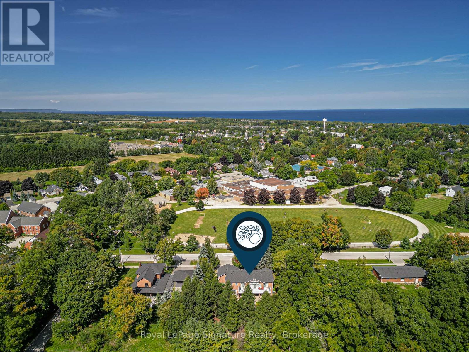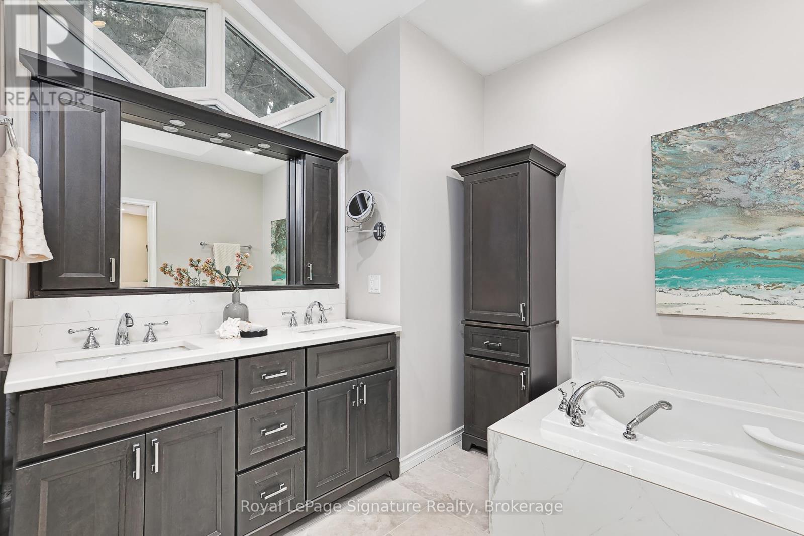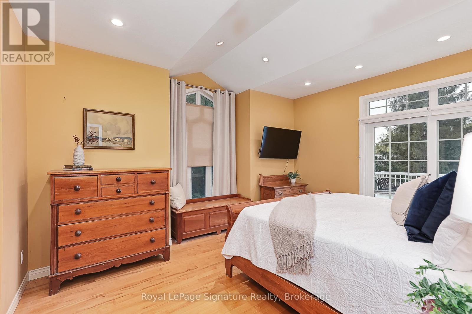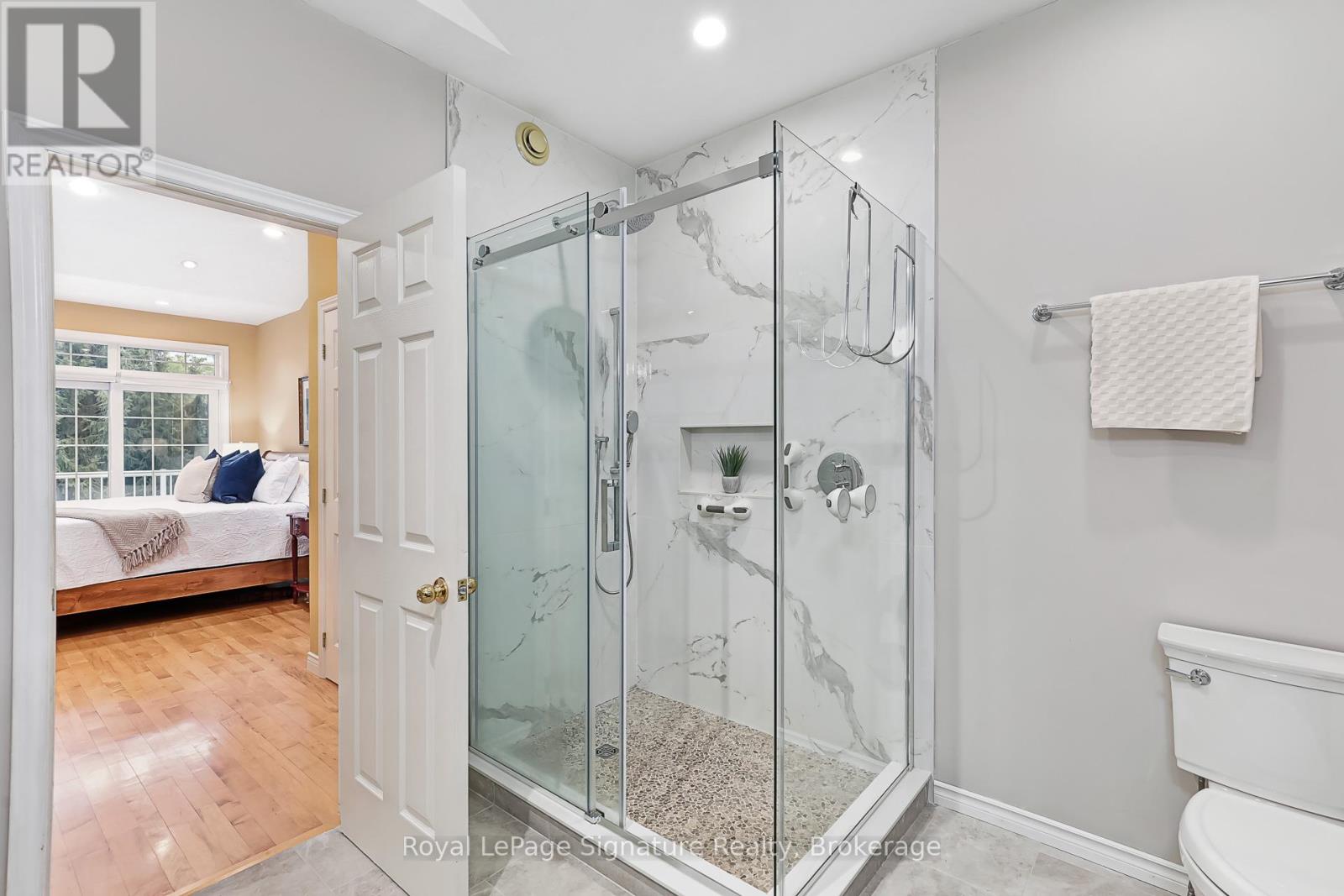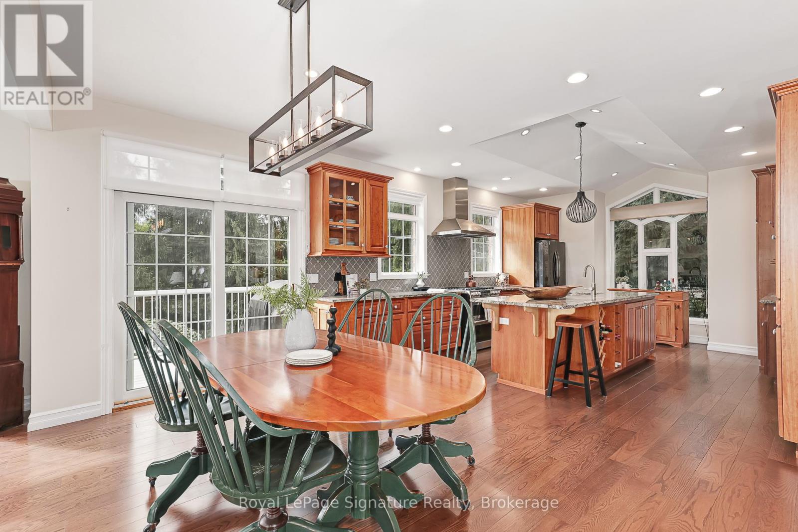 Welcome to 180 Russell, an exceptional brick residence that blends privacy, elegance, and outstanding outdoor living. Set on a rolling, professionally landscaped lot, the property is framed by stone walkways, soldier stone detailing along the driveway, and a stamped concrete entry, creating striking curb appeal from the moment you arrive. Designed for year-round enjoyment, the backyard is a true retreat, featuring a tranquil waterfall, outdoor fireplace, expansive deck, covered patios, and a walk-out lower level-perfect for effortless entertaining and relaxed outdoor living. Inside, the main level offers a bright, open-concept layout where the kitchen, dining, and living areas flow seamlessly together. Large sliding doors extend the living space to a generous deck overlooking the private, serene yard. The primary suite is a private haven with his-and-hers closets and a spa-inspired ensuite with heated floors. A flexible office or den, a full bathroom, convenient laundry, and direct garage access complete the main floor. The fully finished lower level is ideal for hosting and extended family, featuring a spacious family room with gas fireplace, three additional bedrooms, a full bath, and a two-piece bath. Radiant in-floor heating ensures year-round comfort, while the thoughtfully designed second kitchen-equipped with a cooktop, sink, dishwasher, bar fridge, and beverage fridge-enhances both indoor and outdoor entertaining. With its own walk-outs, bedrooms, bathrooms, and kitchen, this level also offers excellent potential for a private in-law suite.Additional highlights include a covered front porch, a two-car garage with inside entry, beautifully curated landscaping, and a Wi-Fi-enabled smart irrigation system for easy lawn and garden maintenance. With its exceptional outdoor spaces, generous interior layout, and peaceful setting, 180 Russell delivers the perfect balance of comfort, functionality, and refined living.