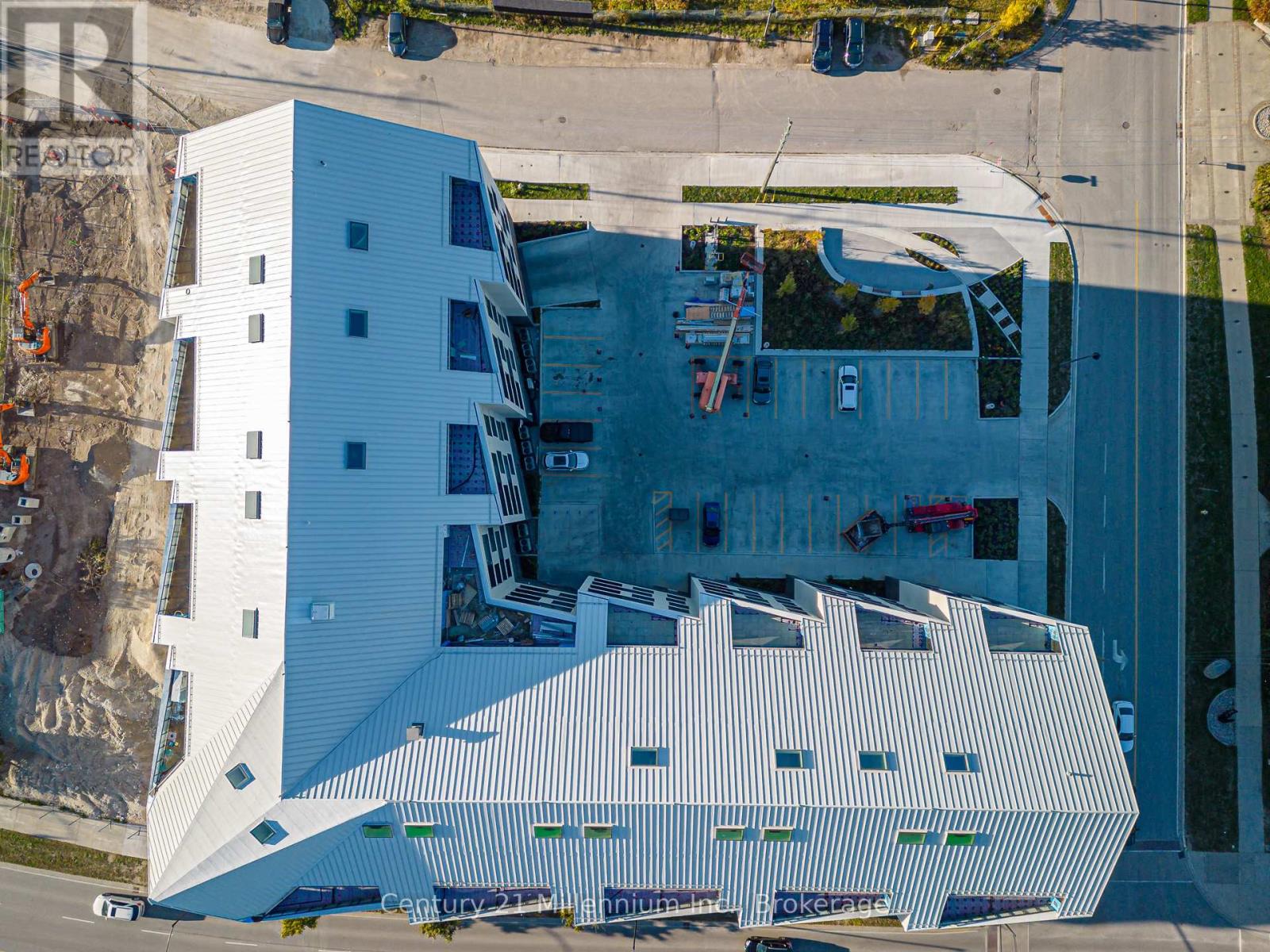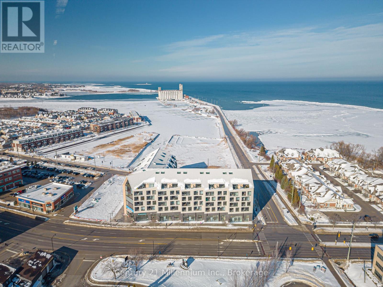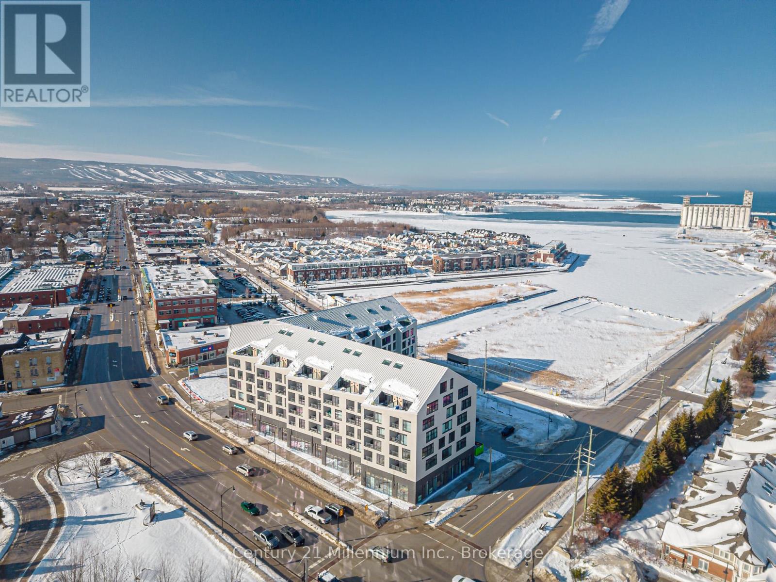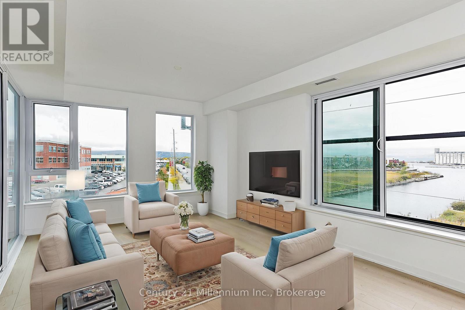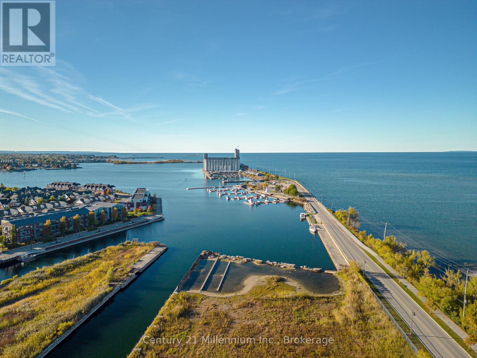 Unbelievable views from this brand new, bright and airy corner end unit in Collingwood's newest condominium community. Welcome to Harbour House in downtown Collingwood, across from the harbour with breathtaking views of Georgian Bay, Collingwood Terminals, and Blue Mountain Escarpment. Enjoy this upgraded 2 bedroom, 2 bathroom home with one level living including 1000 sqft of finished living space plus a 100sqft balcony. Offering a beautiful waterfall quartz countertop with matching backsplash; built-in, hidden dishwasher; modern, coastal flooring; and a desirable open-concept layout. Enjoy a fully equipped exercise room, dog wash station, guest suites, underground parking, fobbed entry and storage locker in a Scandinavian-inspired, architecturally stunning building which captures the nature-centred community perfectly. Located steps to groceries, pharmacies, restaurants, trails, live music, shops and more. A short drive to beaches, ski hills and golf. Collingwood is a true four-season playground, and whether you are looking for a place to hang your hat on weekends, or a home in which to grow your roots, this is the perfect place to soak in the amazing Southern Georgian Bay community.