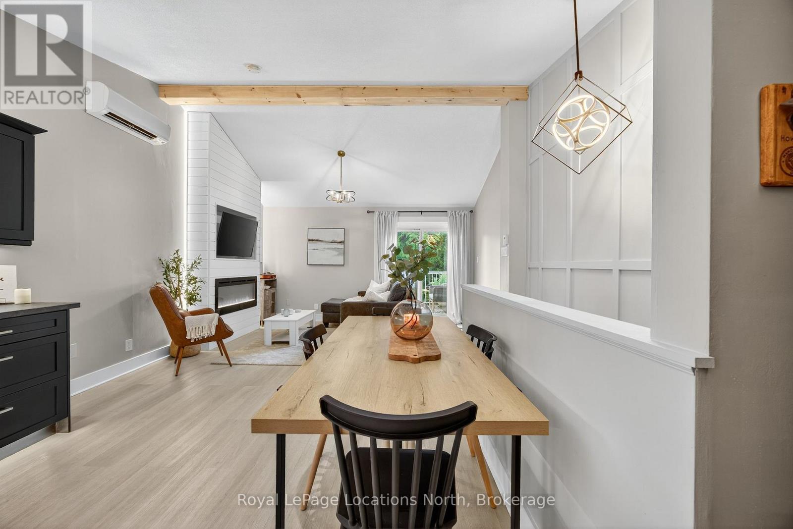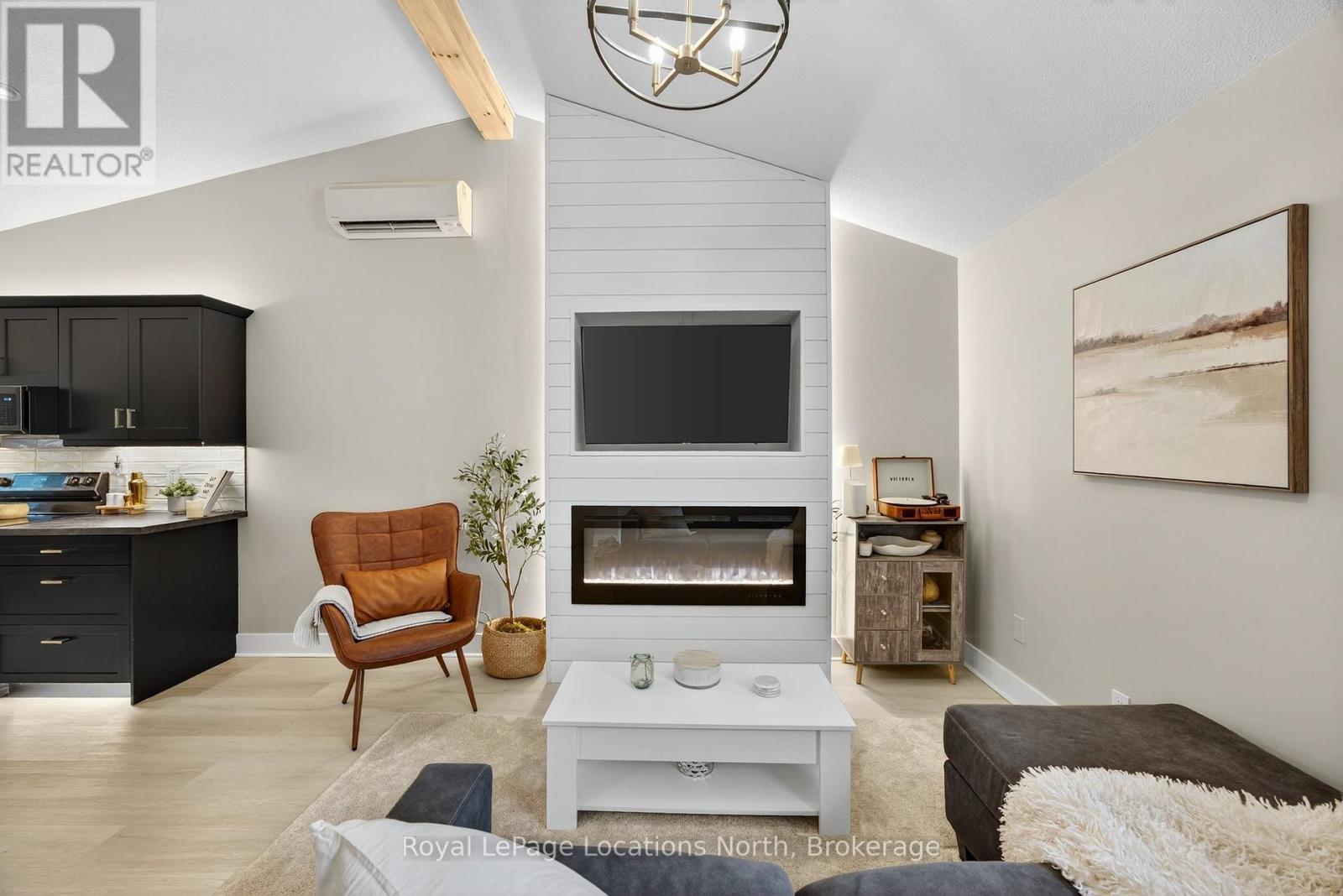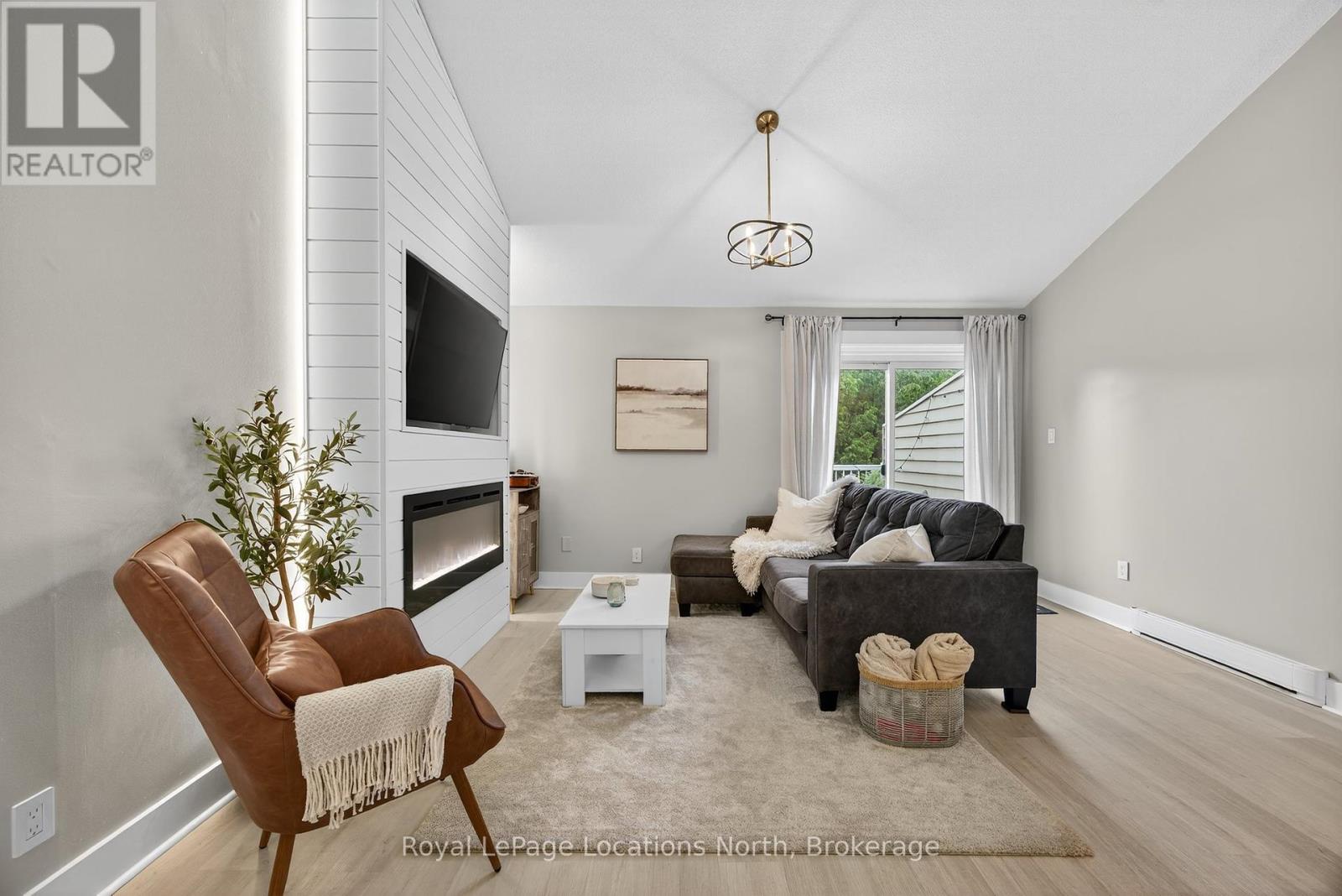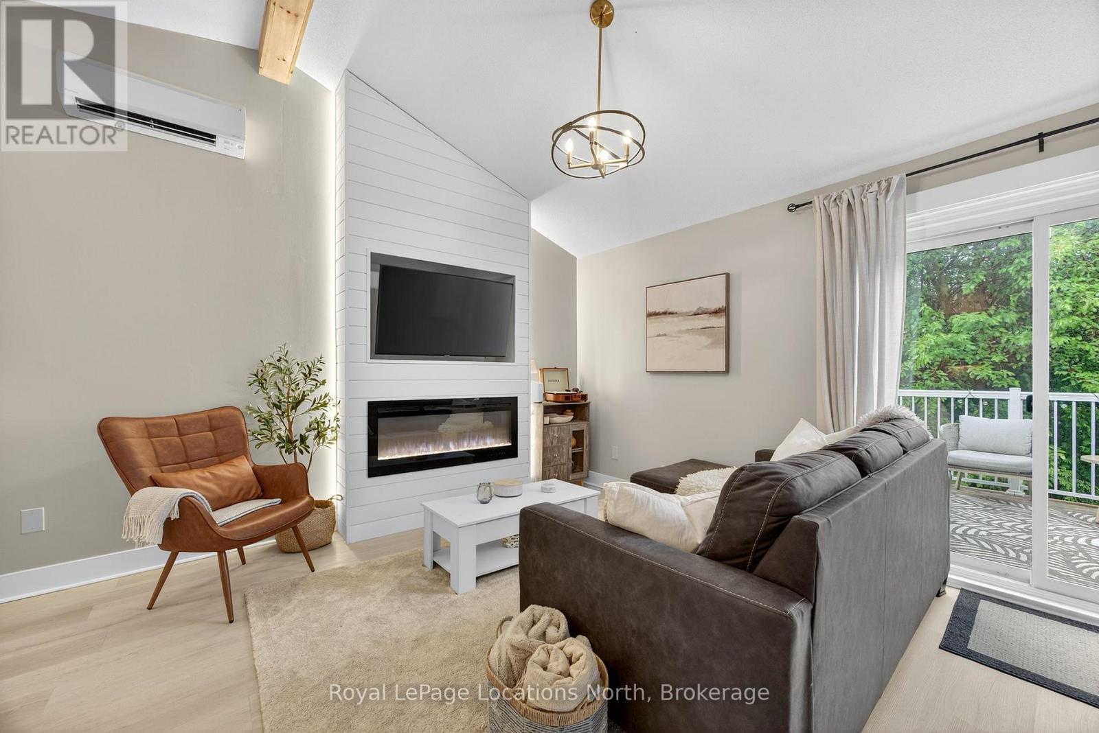 Stunning 2 bed, 1 bath townhouse condo, recently renovated top to bottom. Nestled in the mature trees of Cranberry, this home has been thoughtfully updated throughout, creating a turnkey opportunity for the next owner. The main living/kitchen area is highlighted by a new kitchen (2024) and stainless steel appliances (2024), soaring vaulted ceilings, a custom floor to ceiling electric fireplace wall (2024), and access to a large second storey deck, perfect for taking in sunny afternoons and starry evenings. The ground floor features two sizeable bedrooms, a 4-piece bathroom, and a walkout from the primary bedroom to another outdoor seating area. In addition to an abundance of natural daylight, the custom lighting upgrades are a consistent feature throughout this property. Other recent improvements include a ductless heating/cooling system (2024), hot water tank (2025), baseboard heaters (2024), bathroom (2025), and all new floors and trim (2024). Ideally located in close proximity to everything Collingwood has to offer, and just a few minutes walk to shopping, dining, and Cranberry Golf Course. Book your private showing today!