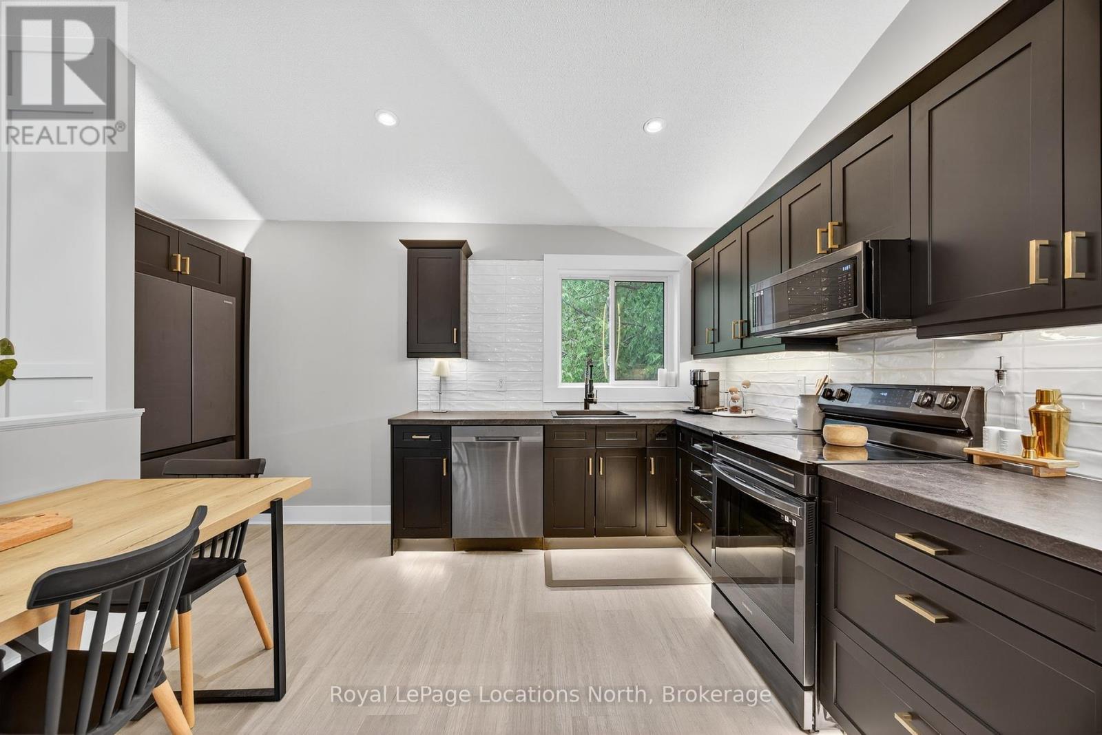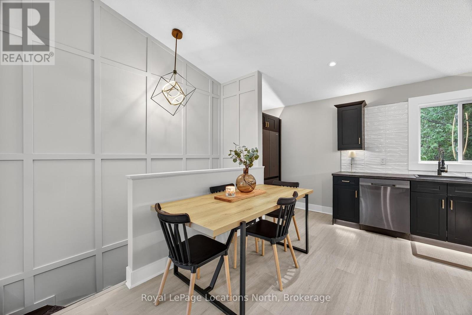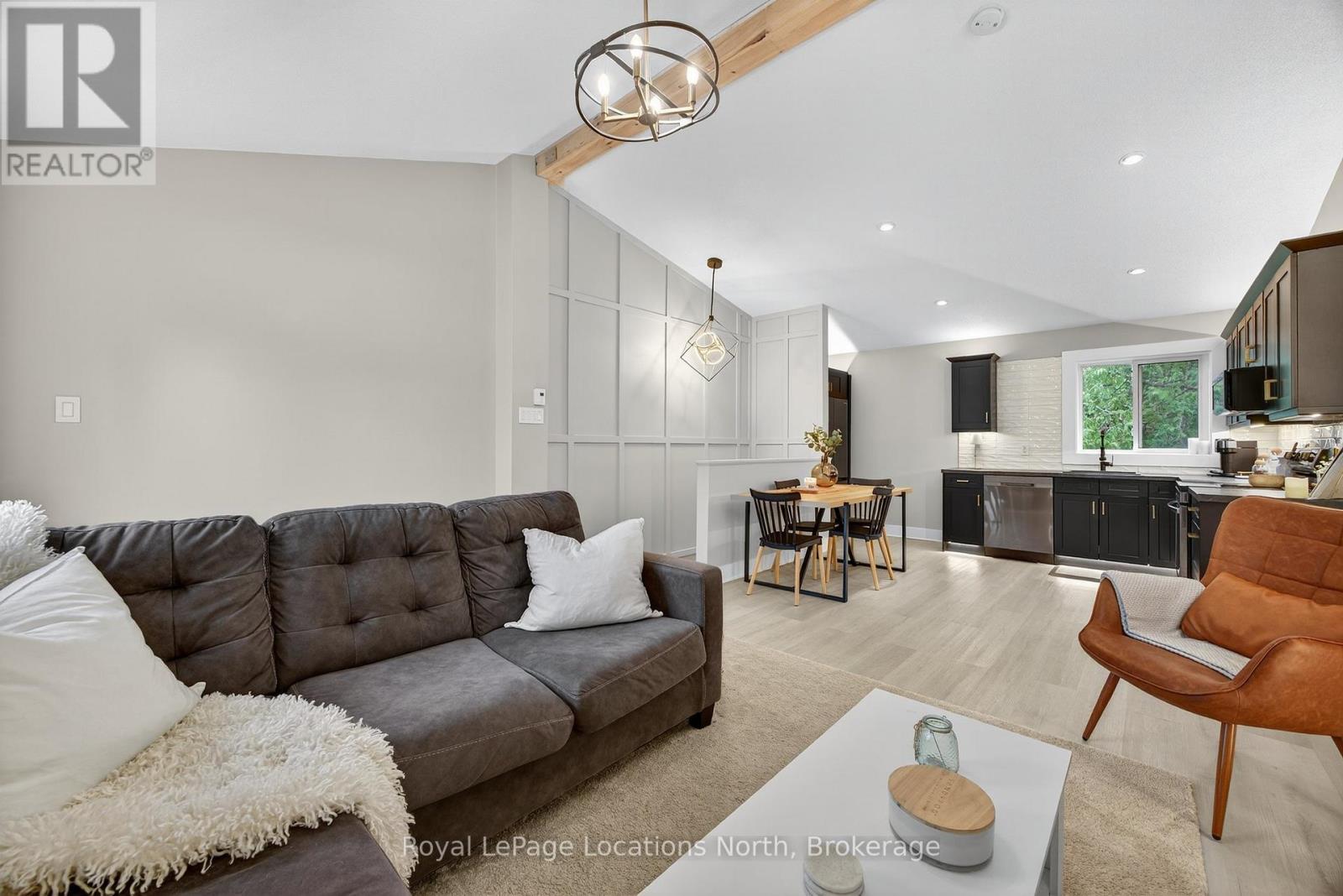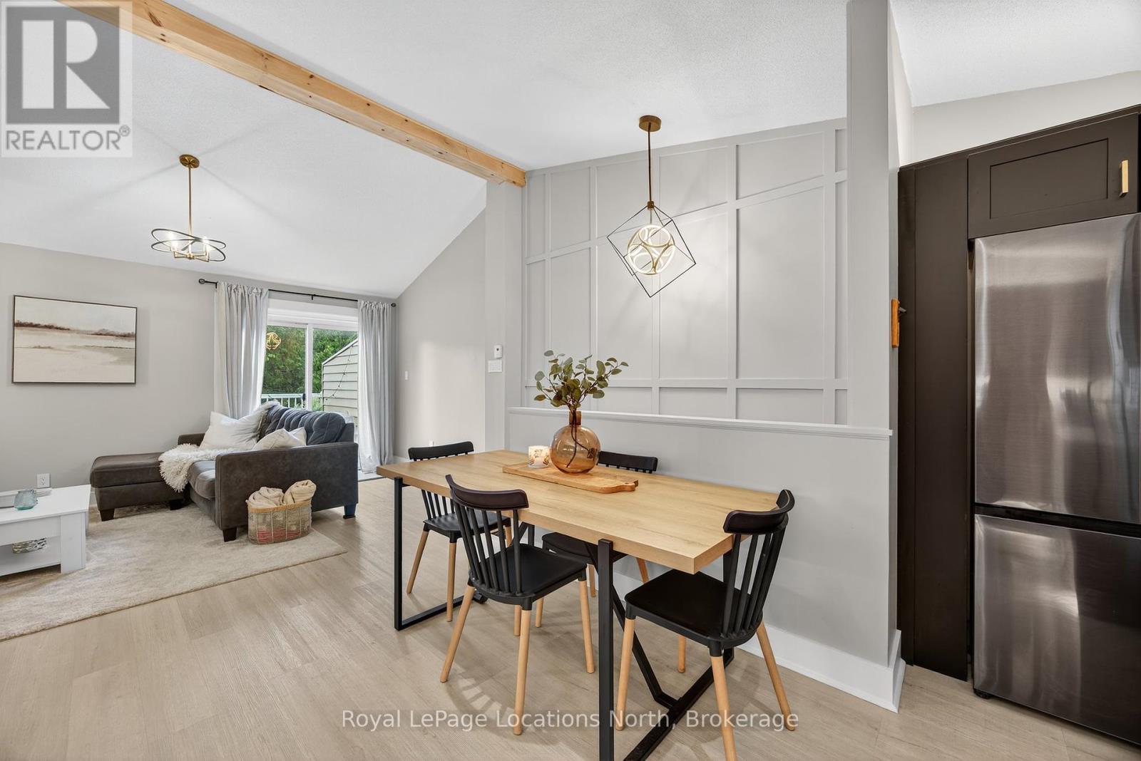 Stunning 2 bed, 1 bath townhouse condo, recently renovated top to bottom. Nestled in the mature trees of Cranberry, this home has been thoughtfully updated throughout, creating a turnkey opportunity for the next owner. The main living/kitchen area is highlighted by a new kitchen (2024) and stainless steel appliances (2024), soaring vaulted ceilings, a custom floor to ceiling electric fireplace wall (2024), and access to a large second storey deck, perfect for taking in sunny afternoons and starry evenings. The ground floor features two sizeable bedrooms, a 4-piece bathroom, and a walkout from the primary bedroom to another outdoor seating area. In addition to an abundance of natural daylight, the custom lighting upgrades are a consistent feature throughout this property. Other recent improvements include a ductless heating/cooling system (2024), hot water tank (2025), baseboard heaters (2024), bathroom (2025), and all new floors and trim (2024). Ideally located in close proximity to everything Collingwood has to offer, and just a few minutes walk to shopping, dining, and Cranberry Golf Course. Book your private showing today!