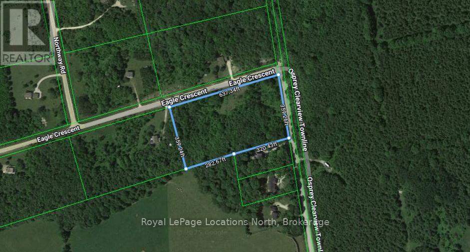 Build your dream home on this 5-acre vacant lot located at the corner of Eagle Crescent and Osprey Clearview Townline. Offering a serene country setting surrounded by nature, this property provides the perfect balance of privacy and accessibility. Outdoor enthusiasts will appreciate being steps away from the Bruce Trail, with endless opportunities for hiking and exploring. Whether you're looking to create a weekend retreat or a family home, this spacious parcel presents a rare opportunity to own a piece of sought-after countryside close to local amenities like Devil's Glen Ski Club, Highland's Nordic, Duntroon Golf Course, and charming nearby amenities in Singhampton, Collingwood and Blue Mountain. Buyer to do own due diligence with Township and Niagara Escarpment.