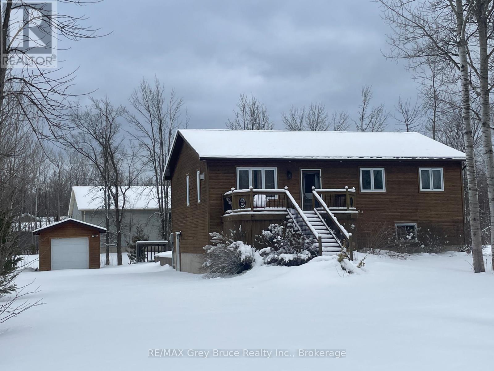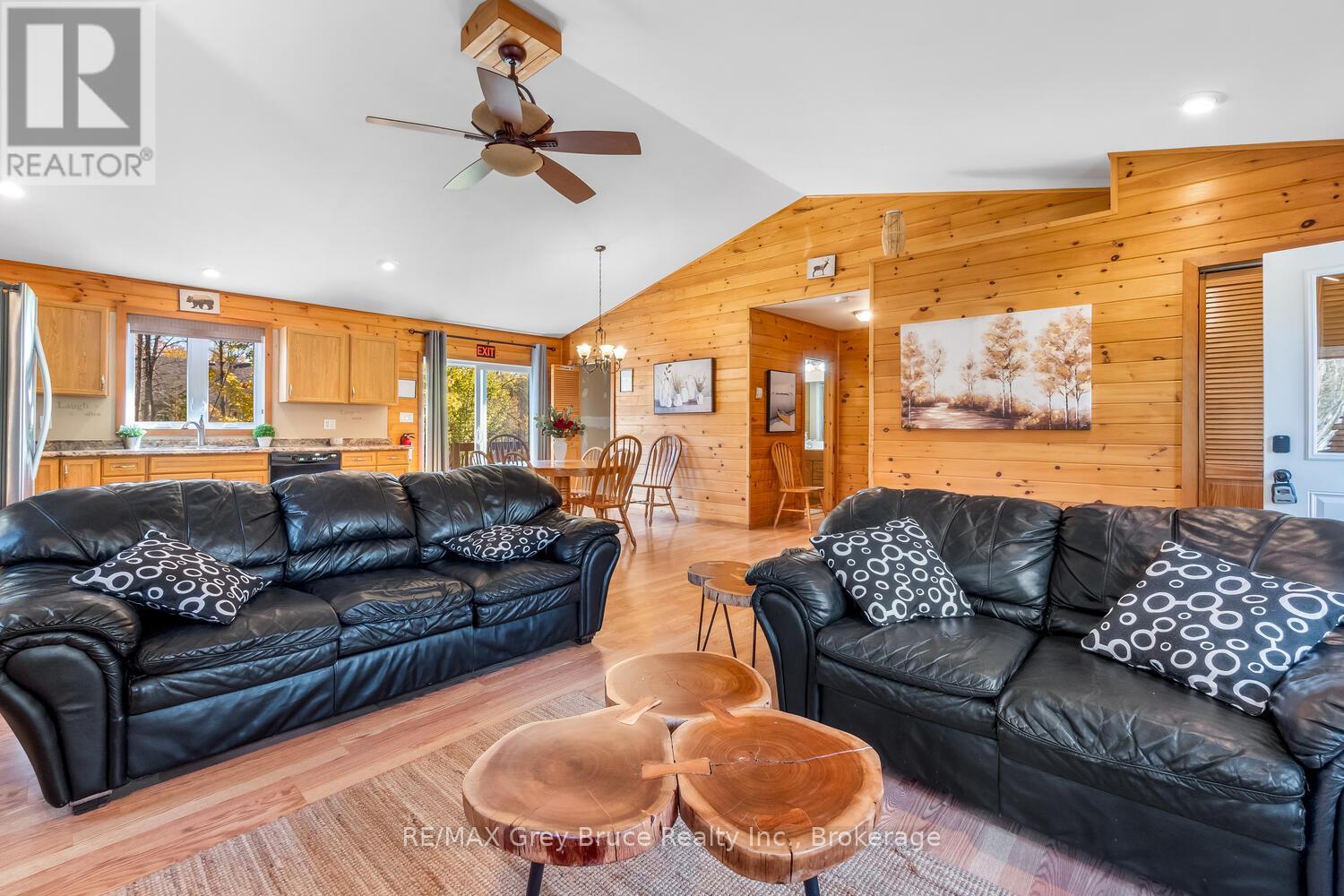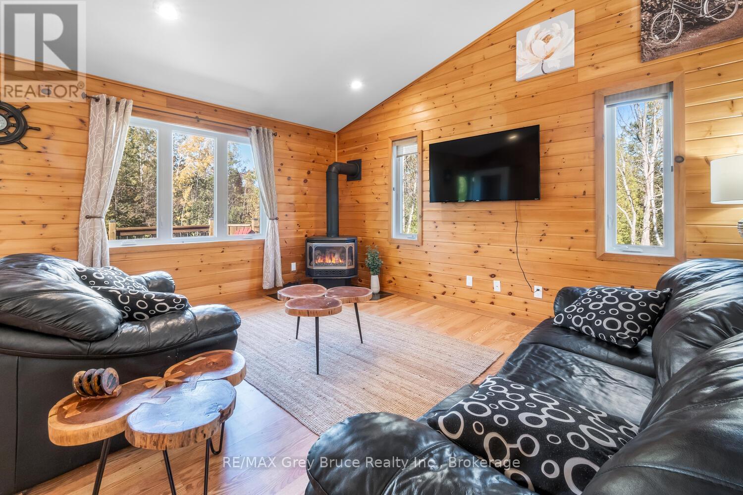 Whether you're searching for a year-round residence or the perfect seasonal getaway, this charming home offers 1,199 sq.ft. of finished living space on the main floor and plenty of potential to expand. Step inside to a warm, inviting interior featuring tongue-and-groove wood finishes, vaulted ceilings, and large windows. The open-concept layout is ideal for family life or entertaining guests. From the dining area, walk out to the back deck and take in peaceful views of the backyard. Start your mornings on the front deck, coffee in hand. Upstairs, you'll find three generously sized bedrooms, each with a closet, ceiling fan, and large window. Easy-care laminate flooring runs throughout, offering low maintenance. The 4-piece bathroom is equipped with tile flooring, a large vanity, and a linen closet. Additional storage on the main level includes an entryway closet and two hallway closets. The lower level adds another 1,199 sq.ft. of space -partially finished and full of potential! Whether you're expanding for a growing family, need guest space or a home office, this level includes a bedroom, 2-piece bathroom, a spacious family room with laundry, and a mudroom - perfect for post-adventure clean-ups after enjoying all that the Bruce Peninsula has to offer. Relax under the stars in the hot tub or gather around the fire pit for cozy evenings. Store your water toys or gear in the detached garage or under-deck storage. Just a short walk, bike ride, or drive brings you to public lake access. Miller Lake is a beloved inland lake, ideal for swimming, kayaking, and boating, thanks to its sandy shoreline and warm waters. With hiking trails, National Park, and countless recreational opportunities nearby, there's always something to explore. Conveniently located between Tobermory and Lion's Head, you'll enjoy easy access to year-round amenities-making this an excellent choice for full-time living or seasonal escapes.