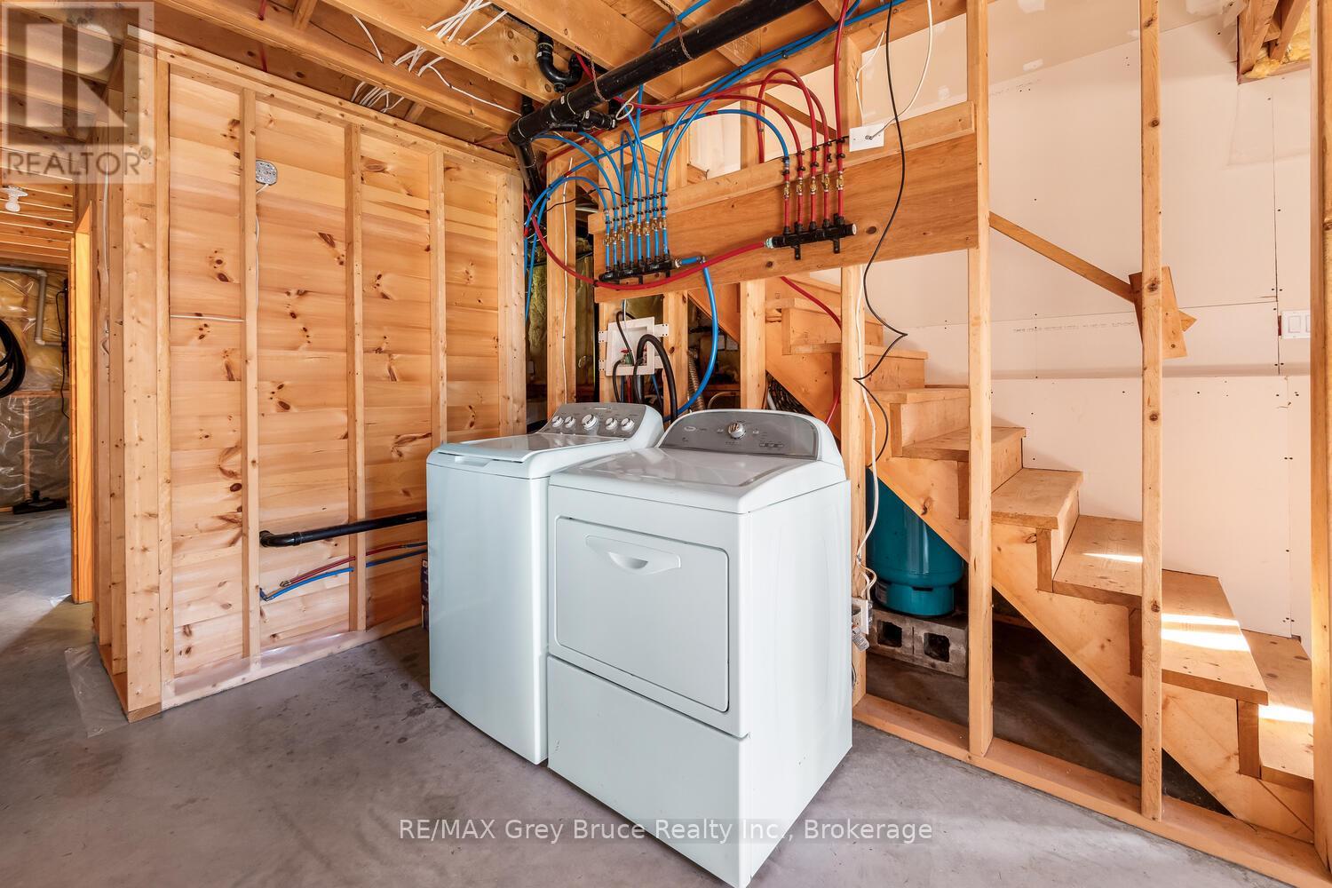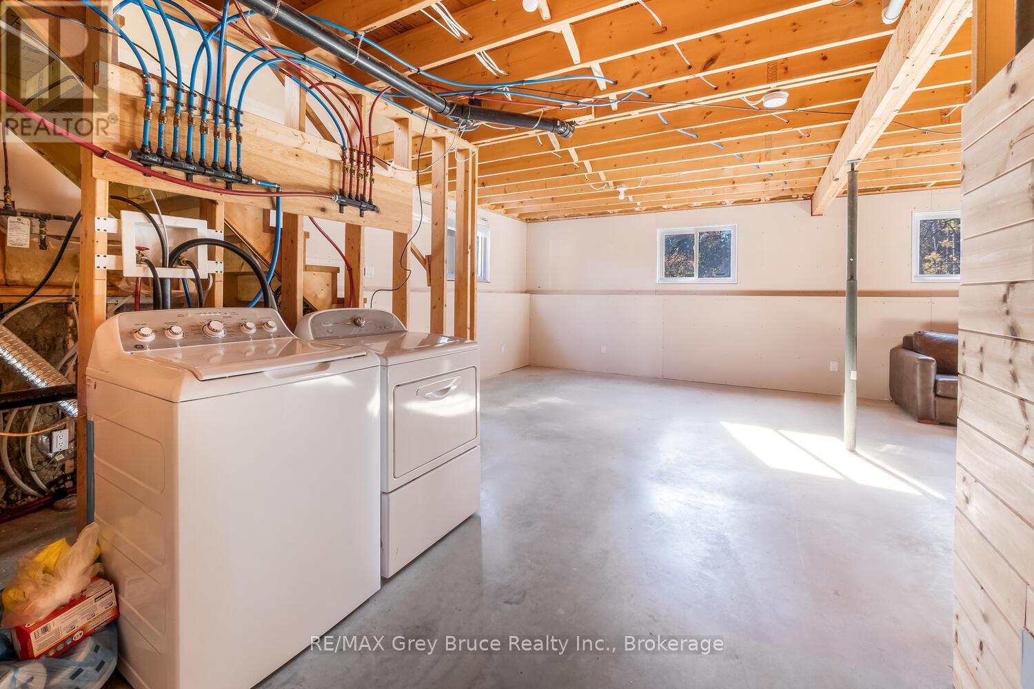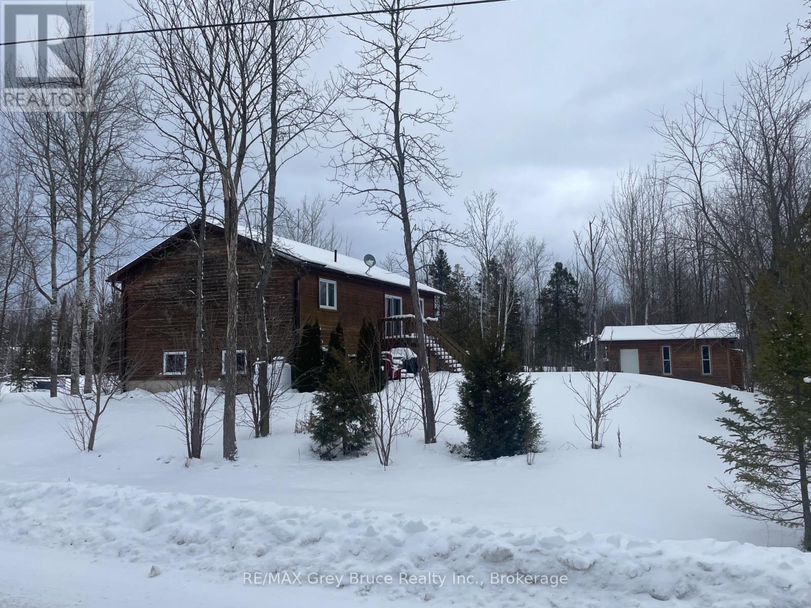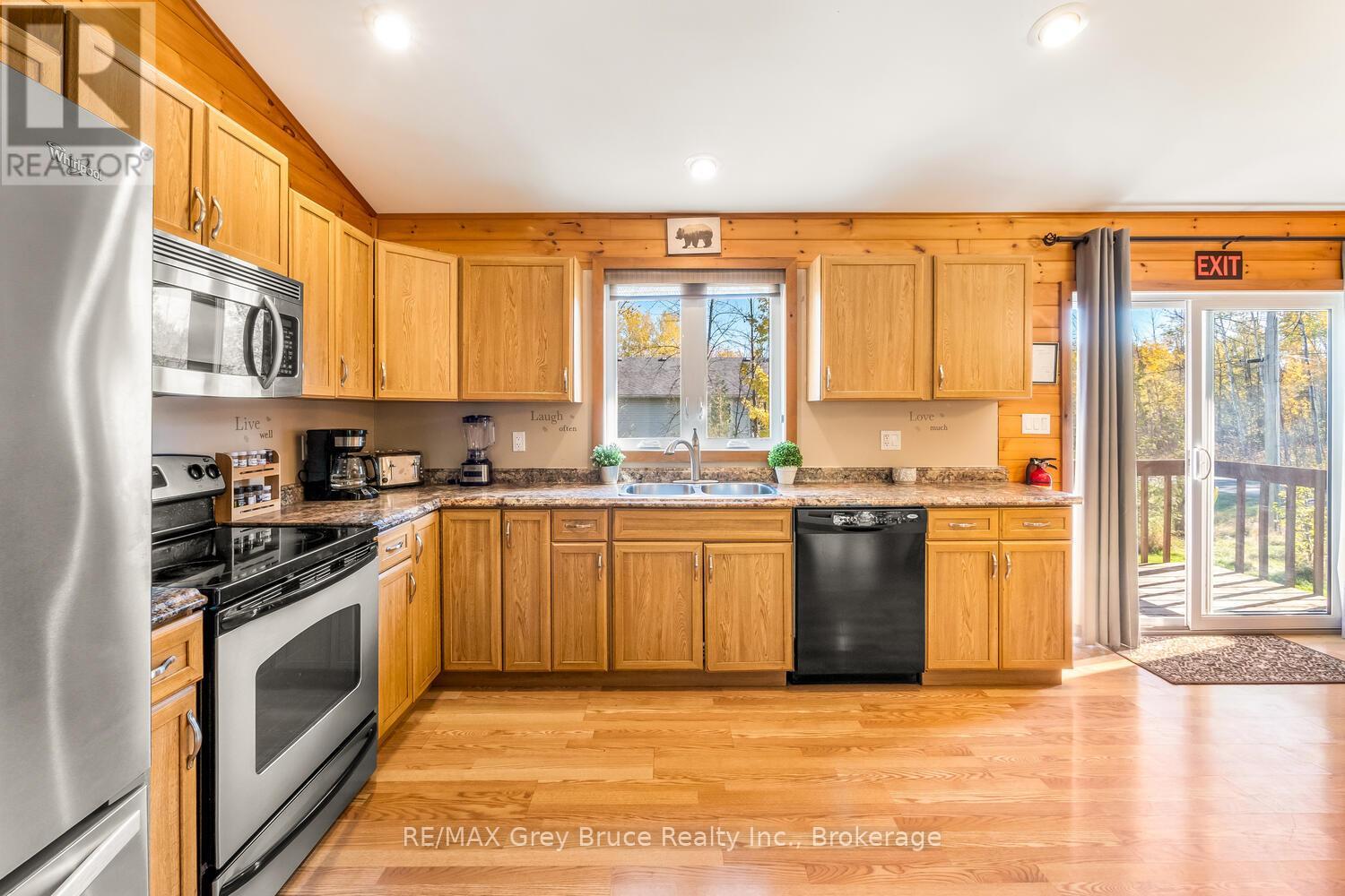 Whether you're searching for a year-round residence or the perfect seasonal getaway, this charming home offers 1,199 sq.ft. of finished living space on the main floor and plenty of potential to expand. Step inside to a warm, inviting interior featuring tongue-and-groove wood finishes, vaulted ceilings, and large windows. The open-concept layout is ideal for family life or entertaining guests. From the dining area, walk out to the back deck and take in peaceful views of the backyard. Start your mornings on the front deck, coffee in hand. Upstairs, you'll find three generously sized bedrooms, each with a closet, ceiling fan, and large window. Easy-care laminate flooring runs throughout, offering low maintenance. The 4-piece bathroom is equipped with tile flooring, a large vanity, and a linen closet. Additional storage on the main level includes an entryway closet and two hallway closets. The lower level adds another 1,199 sq.ft. of space -partially finished and full of potential! Whether you're expanding for a growing family, need guest space or a home office, this level includes a bedroom, 2-piece bathroom, a spacious family room with laundry, and a mudroom - perfect for post-adventure clean-ups after enjoying all that the Bruce Peninsula has to offer. Relax under the stars in the hot tub or gather around the fire pit for cozy evenings. Store your water toys or gear in the detached garage or under-deck storage. Just a short walk, bike ride, or drive brings you to public lake access. Miller Lake is a beloved inland lake, ideal for swimming, kayaking, and boating, thanks to its sandy shoreline and warm waters. With hiking trails, National Park, and countless recreational opportunities nearby, there's always something to explore. Conveniently located between Tobermory and Lion's Head, you'll enjoy easy access to year-round amenities-making this an excellent choice for full-time living or seasonal escapes.