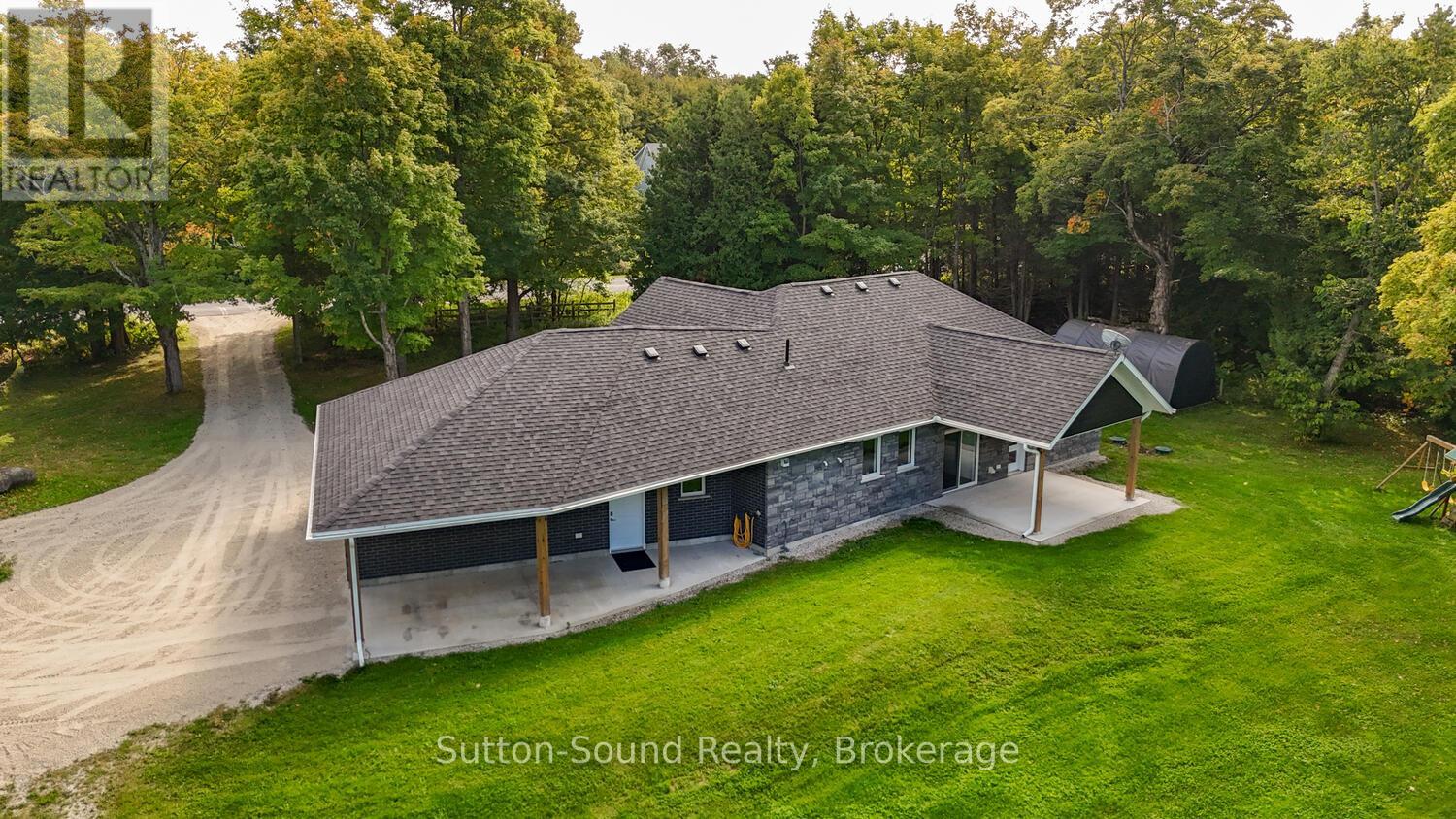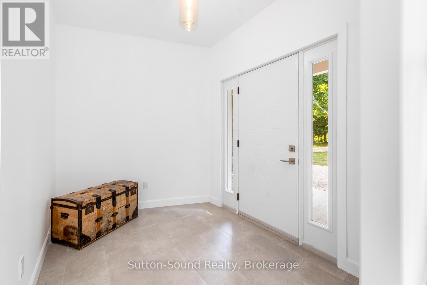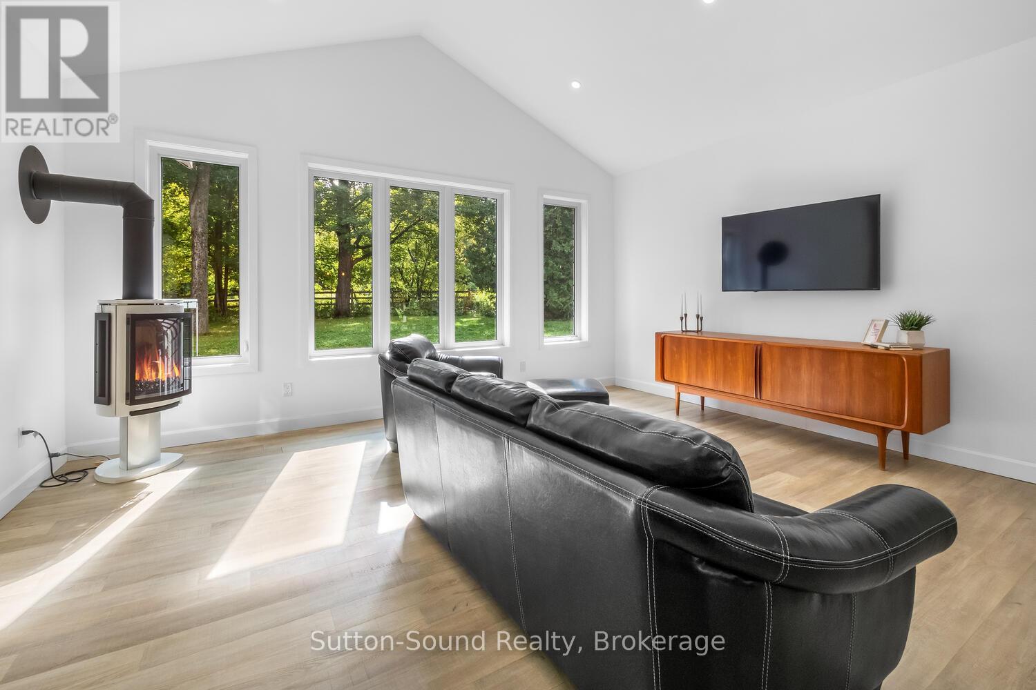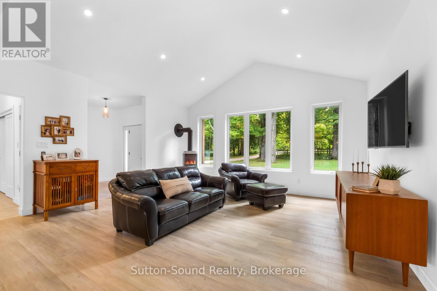 Discover this thoughtfully designed 2 bedroom, 1.5 bathroom bungalow, built in 2018 with sturdy stone and brick construction. Offering comfort, style, and convenience all on one level, its an excellent option for retirees or anyone seeking easy living. The covered front entry welcomes you with no steps into the home, ensuring accessibility for everyone. Inside, you'll find yourself at the heart of the home in a spacious open-concept living area, where high ceilings and large windows fill the space with natural light. A cozy propane fireplace adds warmth and charm to the living room, while the modern kitchen boasts stainless steel appliances, a gas stove, and a large island with seating - perfect for gathering with family or friends. The seamless flow of the layout makes it ideal for both everyday living and entertaining. The primary bedroom features ensuite access to a luxurious 4-piece bathroom, complete with a walk-in shower and relaxing soaker tub. Across the hall, the second bedroom overlooks the private backyard. The laundry room, equipped with a Maytag washer and gas dryer, offers a walkout to the covered patio - an inviting space to enjoy the outdoors. Additional conveniences include abundant closet storage and a handy 2-piece bathroom located off the garage, perfect for guests. Radiant in-floor heating throughout the home ensures steady, efficient warmth all year round. Outside, the property offers plenty of space and parking options with an attached 2 car garage, additional carport, and dual driveway access with fresh gravel, allowing for a circular drive. Set on a generous 1-acre lot, this home provides room to relax and enjoy nature, while still being just minutes from the amenities of Lions Head, Georgian Bay, hiking trails, and more. Blending modern design with the ease of one-level living, this home is a welcoming retreat on the beautiful Bruce Peninsula.