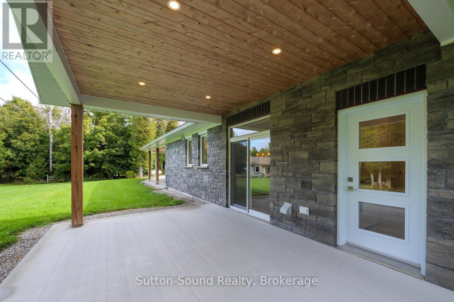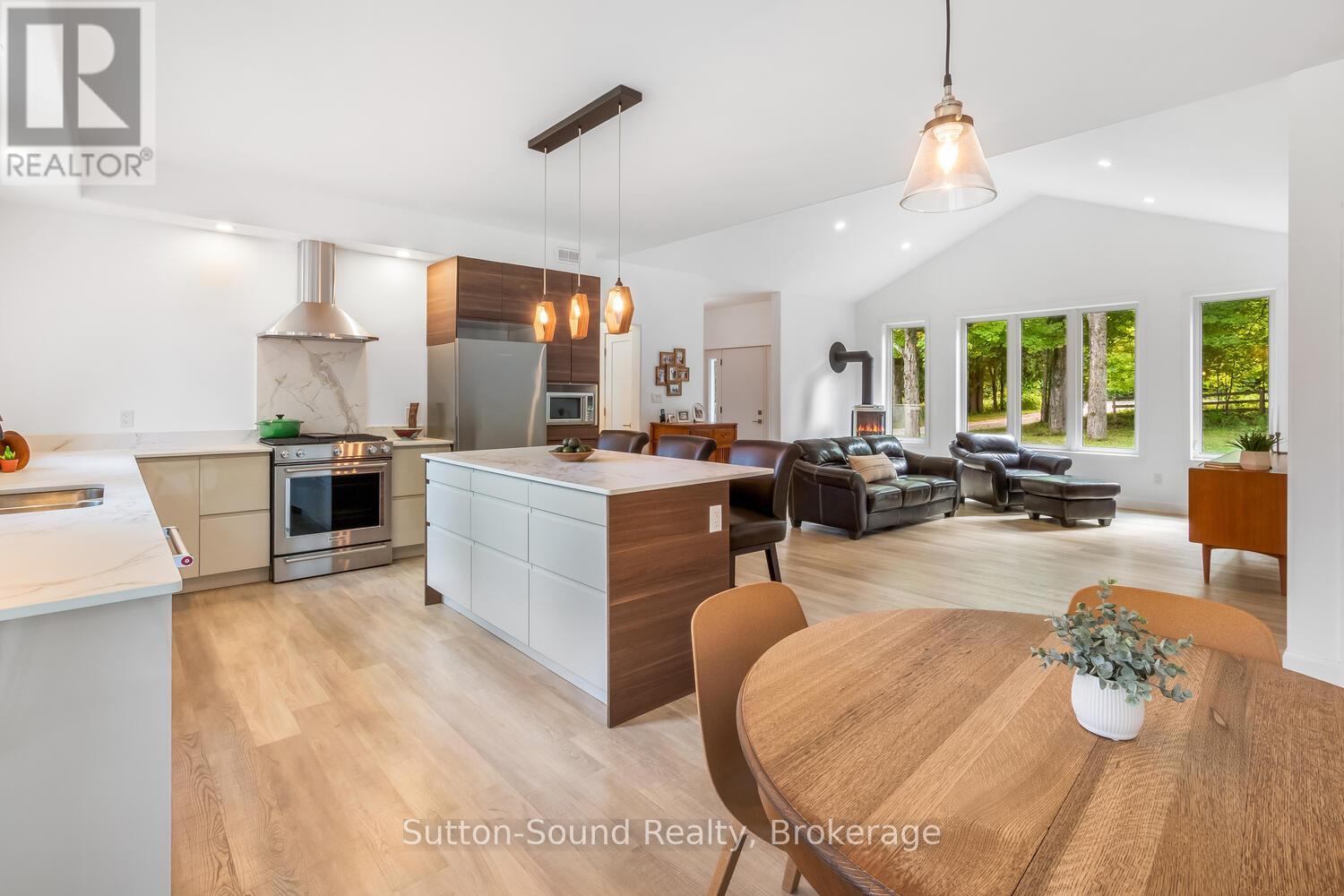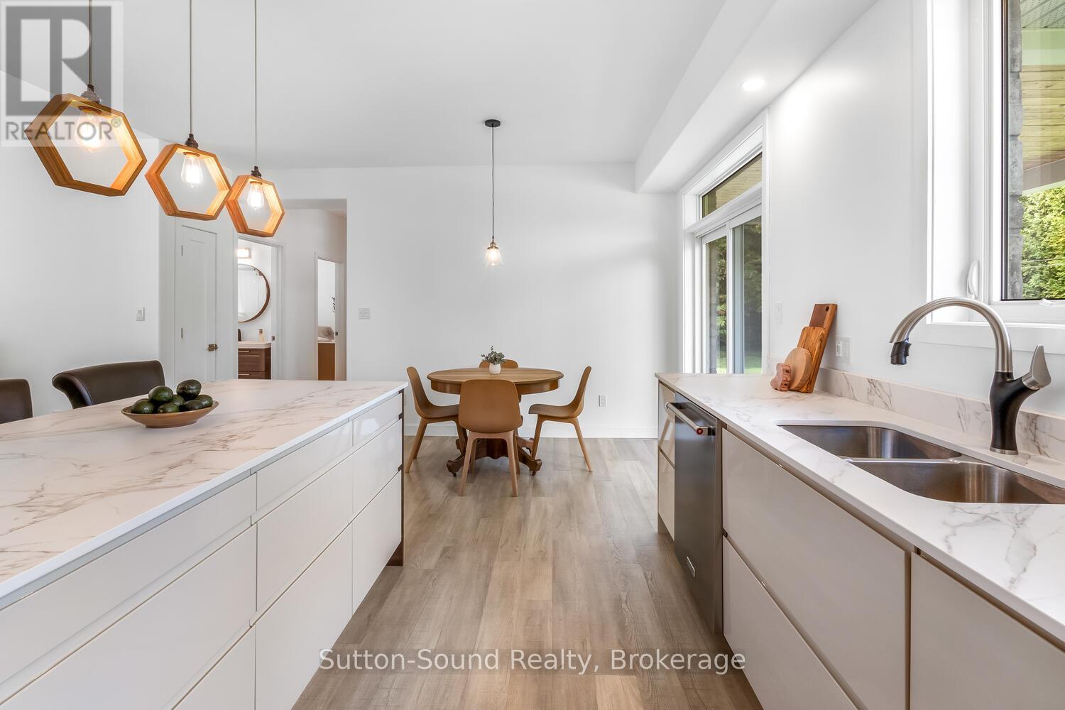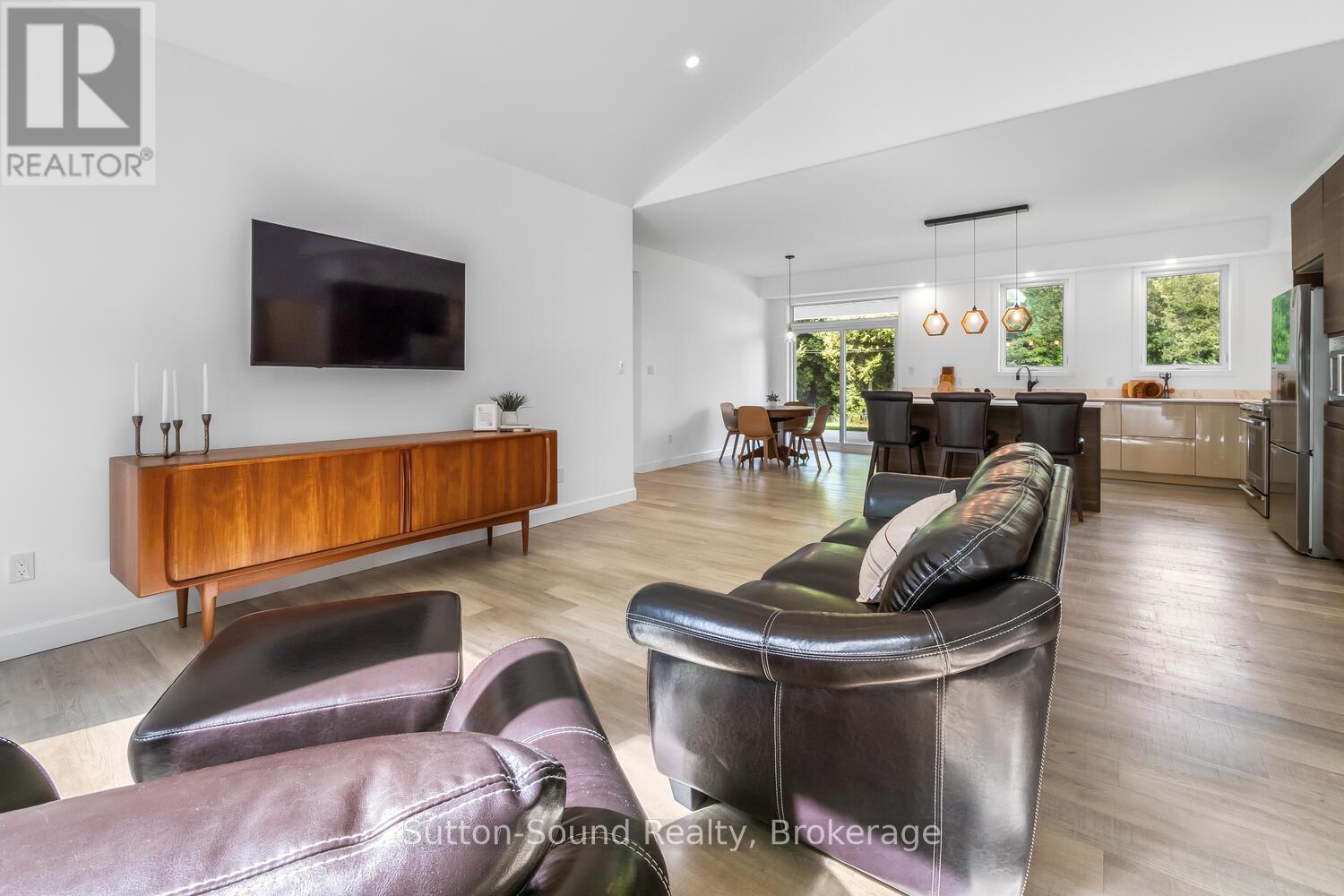 Discover this thoughtfully designed 2 bedroom, 1.5 bathroom bungalow, built in 2018 with sturdy stone and brick construction. Offering comfort, style, and convenience all on one level, its an excellent option for retirees or anyone seeking easy living. The covered front entry welcomes you with no steps into the home, ensuring accessibility for everyone. Inside, you'll find yourself at the heart of the home in a spacious open-concept living area, where high ceilings and large windows fill the space with natural light. A cozy propane fireplace adds warmth and charm to the living room, while the modern kitchen boasts stainless steel appliances, a gas stove, and a large island with seating - perfect for gathering with family or friends. The seamless flow of the layout makes it ideal for both everyday living and entertaining. The primary bedroom features ensuite access to a luxurious 4-piece bathroom, complete with a walk-in shower and relaxing soaker tub. Across the hall, the second bedroom overlooks the private backyard. The laundry room, equipped with a Maytag washer and gas dryer, offers a walkout to the covered patio - an inviting space to enjoy the outdoors. Additional conveniences include abundant closet storage and a handy 2-piece bathroom located off the garage, perfect for guests. Radiant in-floor heating throughout the home ensures steady, efficient warmth all year round. Outside, the property offers plenty of space and parking options with an attached 2 car garage, additional carport, and dual driveway access with fresh gravel, allowing for a circular drive. Set on a generous 1-acre lot, this home provides room to relax and enjoy nature, while still being just minutes from the amenities of Lions Head, Georgian Bay, hiking trails, and more. Blending modern design with the ease of one-level living, this home is a welcoming retreat on the beautiful Bruce Peninsula.