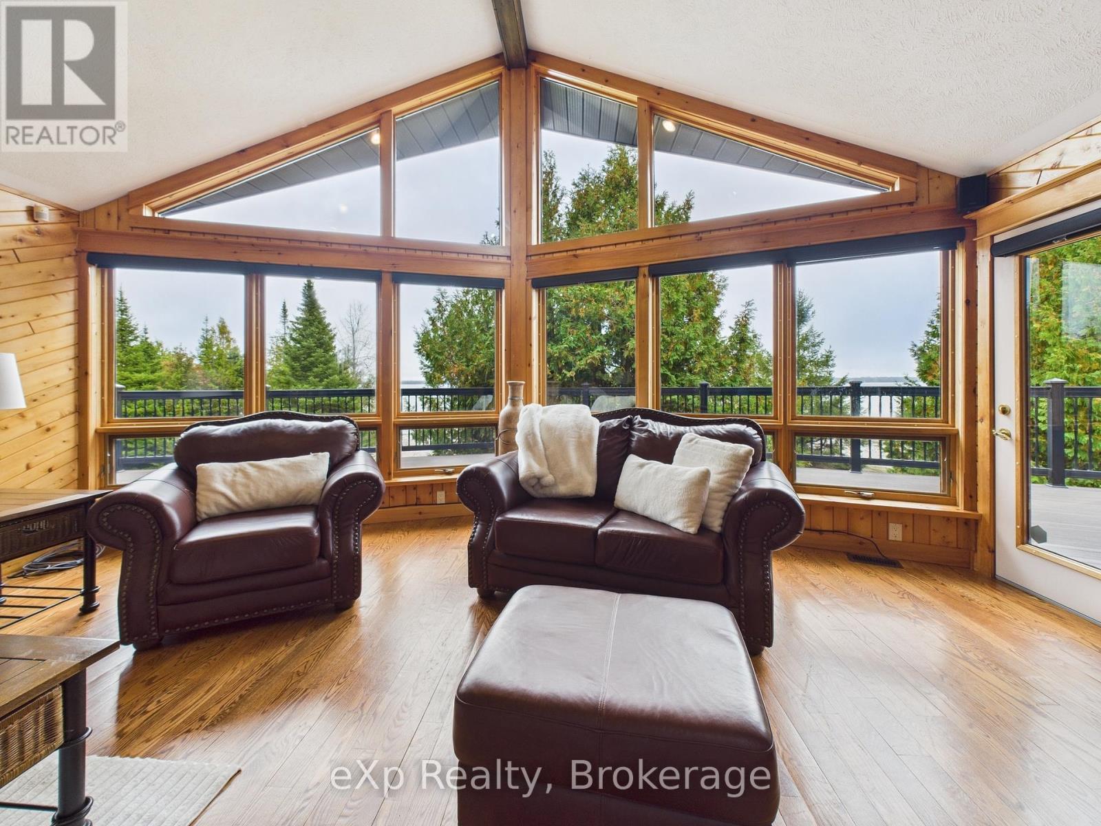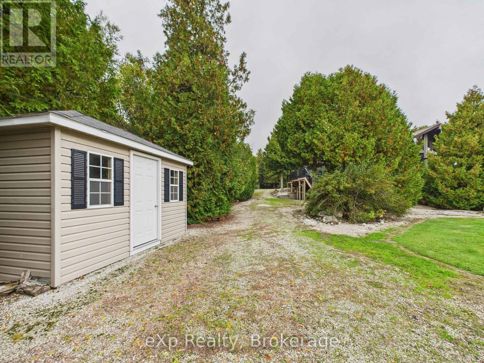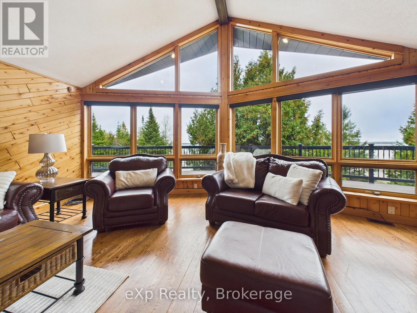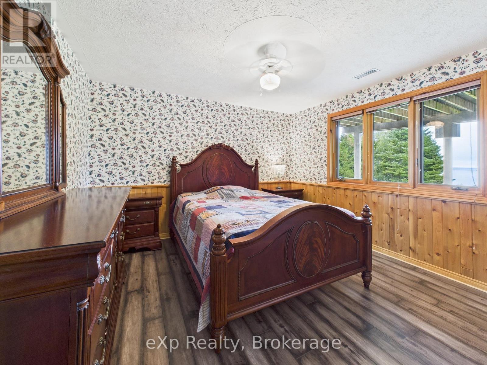 Welcome to 31 Goderich Point Loop, Northern Bruce Peninsula, a stunning waterfront sanctuary that guarantees exceptional privacy and showcases the beauty of nature. Nestled on a generous lot with crystal-clear waters and a private dock, this property is perfect for accommodating your watercraft, including larger boats, thanks to its ample depth. Constructed in 1996, this two-story residence encompasses four spacious bedrooms and three bathrooms, along with a walkout basement featuring multiple entrances. At the heart of the home lies a magnificent stone fireplace that enhances the inviting atmosphere throughout the space. The interior is adorned with exquisite wood finishes, while expansive windows allow an abundance of natural light and offer breathtaking views. Step outside onto the composite wraparound deck, ideal for entertaining or simply savoring the mesmerizing sunsets. A long driveway leads to the home, enhancing its secluded feel, while the double-car garage provides added convenience. Whether you're relishing a tranquil morning by the water or hosting gatherings with friends and family, this property is thoughtfully designed for relaxation and connection with the surrounding natural landscape.