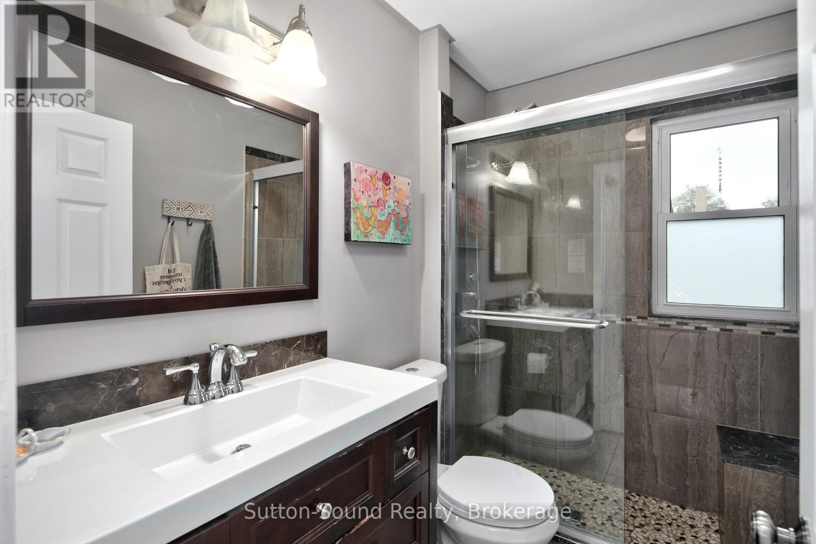 This charming 2-bedroom bungalow is full of character and thoughtful updates, offering easy living in a quiet residential area on the east side of Owen Sound! Step inside and you'll find a bright, inviting space with fresh flooring in the kitchen, dining, and mudroom areas. The kitchen has been tastefully refreshed with a new counter, sink, and fridge, creating a clean and functional hub for daily life. The cozy layout features hardwood flooring in both bedrooms and under the carpet in the living room, a renovated 3-piece bath (2018), and convenient main floor laundry. Enjoy the comfort and efficiency of a new heat pump and A/C unit, with electric baseboards as backup. Outside, relax on the back deck (2021) or unwind in the hot tub (as is) within the fully fenced yard-perfect for kids, pets, or private outdoor entertaining. Two storage sheds provide plenty of space for tools and toys. The home's exterior has been upgraded with vinyl siding, eavestrough, soffit, and fascia, and the roof shingles were replaced in 2019, giving peace of mind for years to come. Located close to parks, schools, shopping, the hospital, and public transit-this is a must-see for first-time buyers or those looking to downsize and enjoy simple, comfortable living in a great neighborhood.