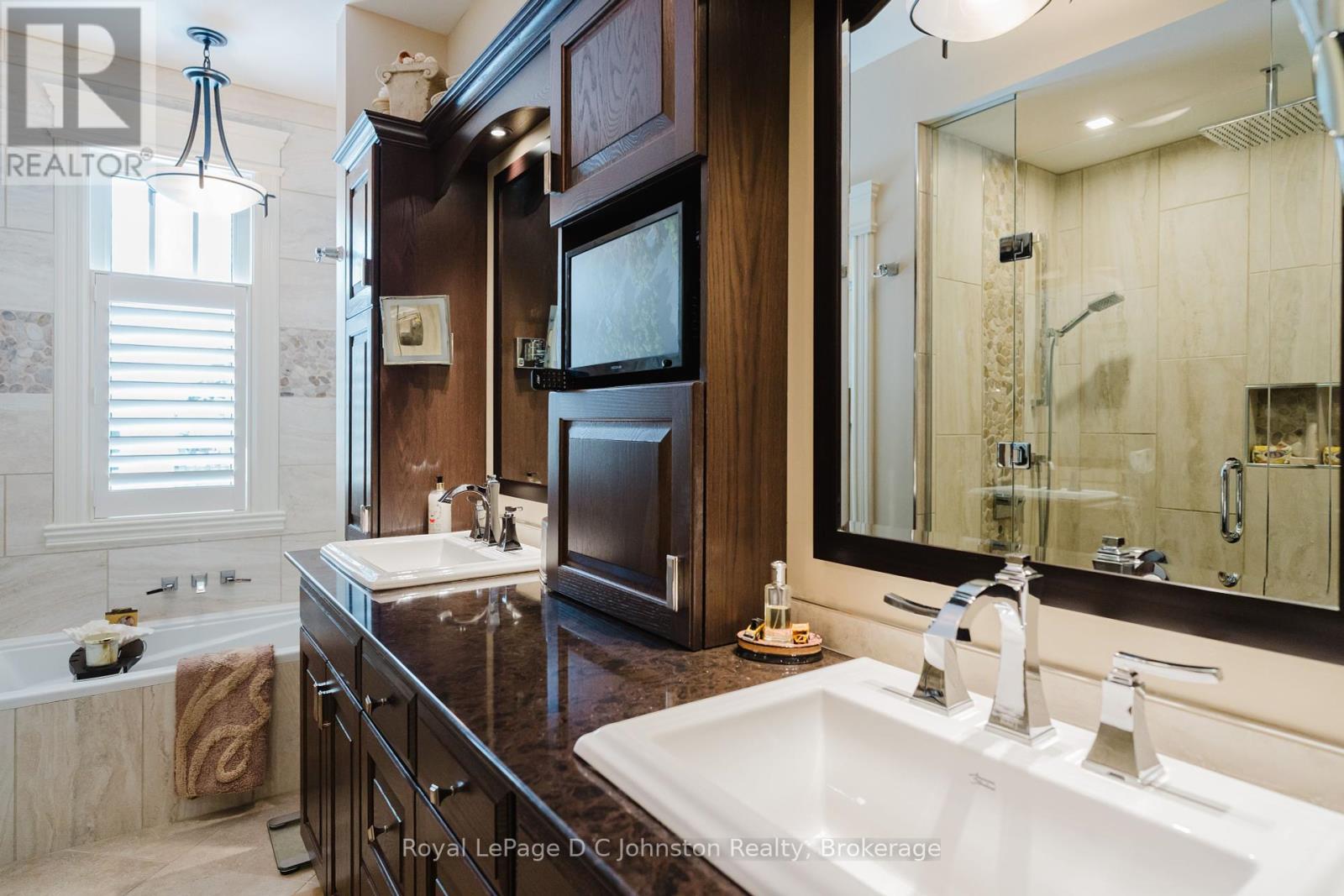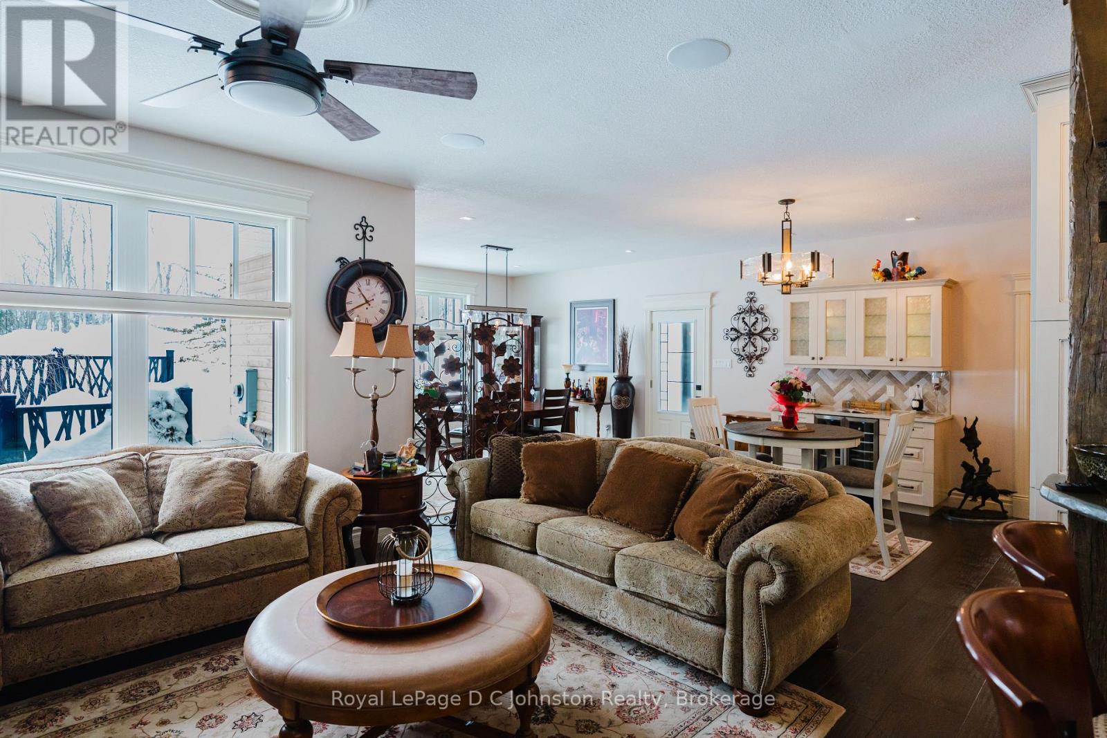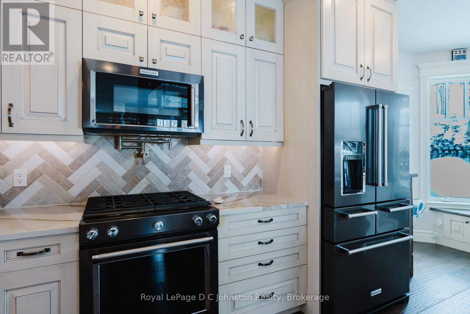 Experience the pinnacle of luxury in this stunning 4 bedroom, 4 bathroom home, custom built by Berner Contracting in 2005. Nestled on a mature lot in an exclusive enclave in Port Elgin, the home spans over 5,000 square feet on 3 levels and has been meticulously updated and renovated since 2019, blending elegance, comfort and functionality. Inside, find exquisite craftsmanship, including rustic barn board and beam details that add touches of warmth. A newly designed gourmet kitchen features a unique island adorned by hand-hewn posts, ambient lighting, Cambria countertops, and top-tier stainless steel appliances. The inviting dining room is sectioned for formal and more casual dining, complete with a built in butler's pantry. There are two versatile office spaces on the main floor, perfect for work from home or easily adaptable for playroom, guest room or more living space. A stylish guest bath is conveniently located off the main hall. The master suite has been thoughtfully reconfigured to include a spa-like ensuite with heated floors and a dreamy walk-in closet/dressing room. The main floor laundry room boasts custom cabinetry and heated ceramic floors. Upstairs, the loft offers a cozy living space with skylight, two guest bedrooms, and a beautifully re-modelled bathroom. The basement has been enhanced with a larger, brighter window for proper egress, 4th bedroom and bath, recreation room and plenty of storage space. A basement workshop with walk-up access to the double garage provides the perfect space for projects. New roof shingles were installed June 2024. Whole home Generac generator. Outside, an interlock stone driveway leads to a fenced-in space for your dog, 2 garden sheds, a fully fenced yard, Armour stone landscaping with built in sprinkler system and a reimagined front porch with elegant stonework. Every detail of this home has been thoughtfully curated to offer an unparalleled living experience - don't miss the opportunity to make it yours!