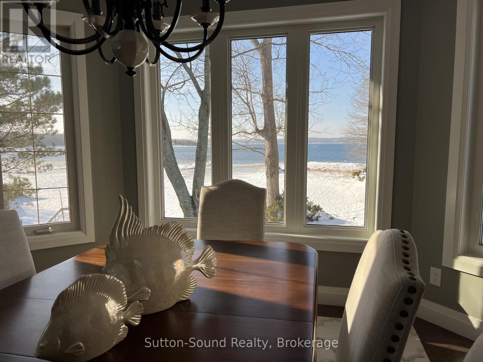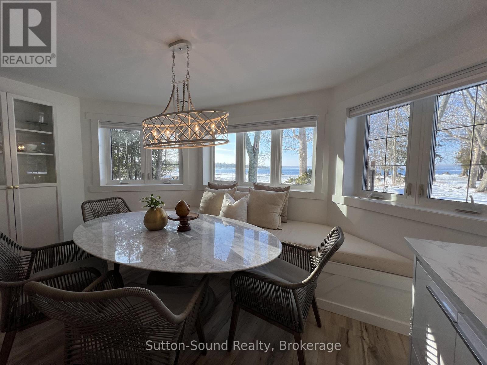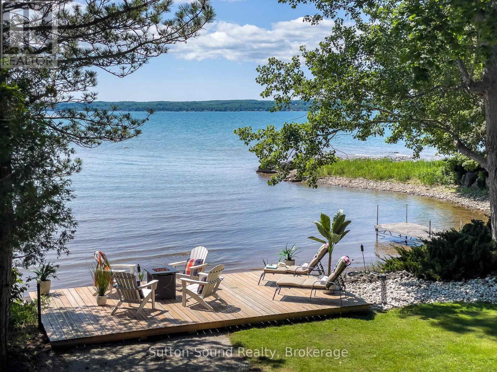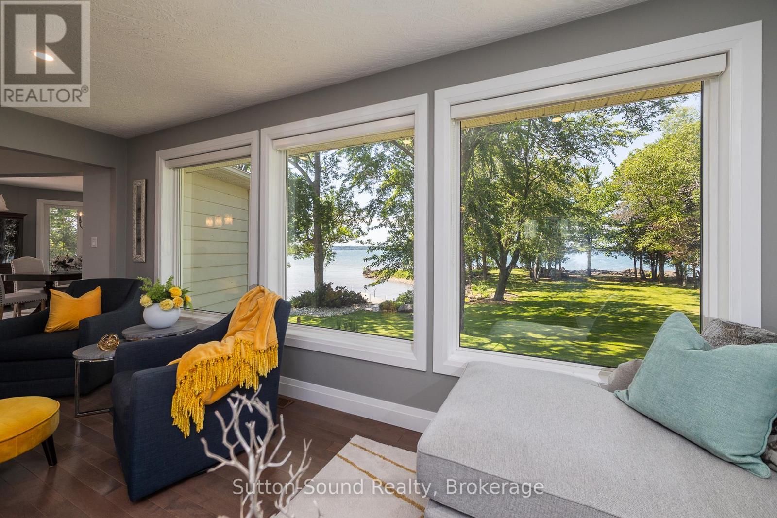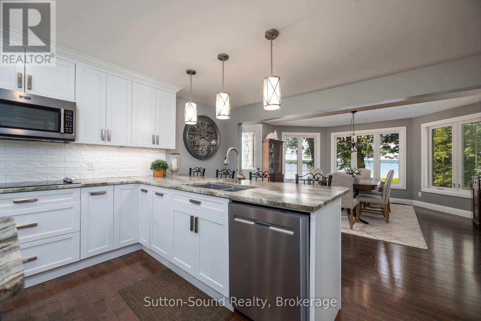 Welcome to 359288 Grey Rd 15, a beautifully updated Georgian Bay waterfront retreat just minutes from Owen Sound. This impeccably maintained 4-bedroom, 3 bathroom bungalow with attached garage offers over 400 ft of pristine shoreline, and is nestled on a sprawling, beautifully landscaped 0.65 acre lot with panoramic views and unforgettable sunsets. Designed with both comfort and sophistication in mind, the main level features a spacious, open concept eat-in kitchen complete with a granite island- ideal for entertaining- flowing seamlessly into a stunning dining room addition with expansive windows that frame the captivating waterfront. The main floor also hosts a powder room, living room with gas fireplace, two generously sized bedrooms and a spa-inspired bathroom showcasing exquisite tilework and glass walk-in shower. Energy-efficient ground source heating ensures year-round comfort. The fully finished lower level, with its own private entrance, offers exceptional versatility- perfect for extended family or guests- featuring a second dine-in kitchen with quartz countertops, a welcoming living room with electric fireplace, two additional bedrooms, and a beautifully appointed 4-pc bath with soaking tub and tiled shower. Step outside and the multiple entertaining areas, a spacious dock, and thoughtfully designed spaces invite you to relax and enjoy the very best of refined waterfront living.