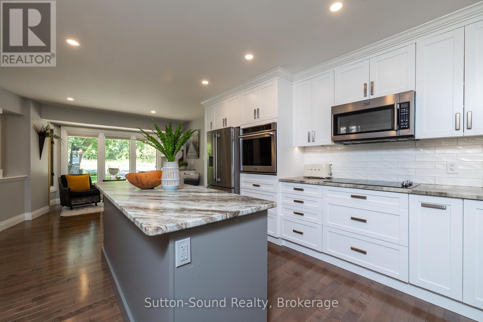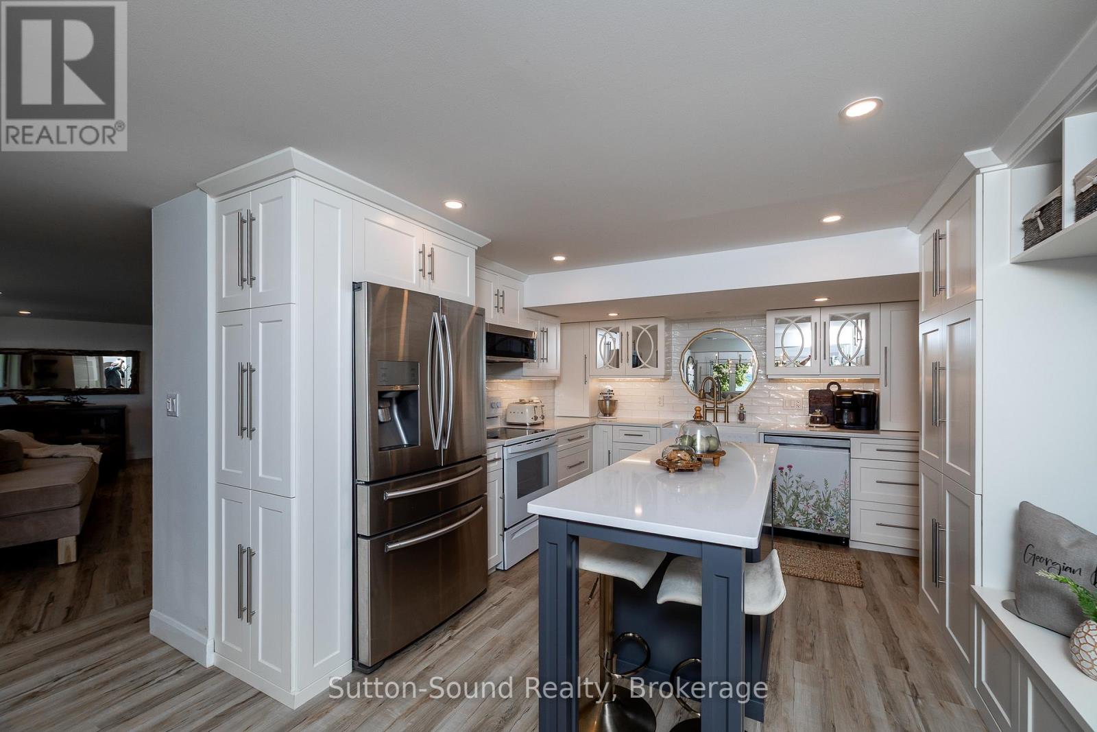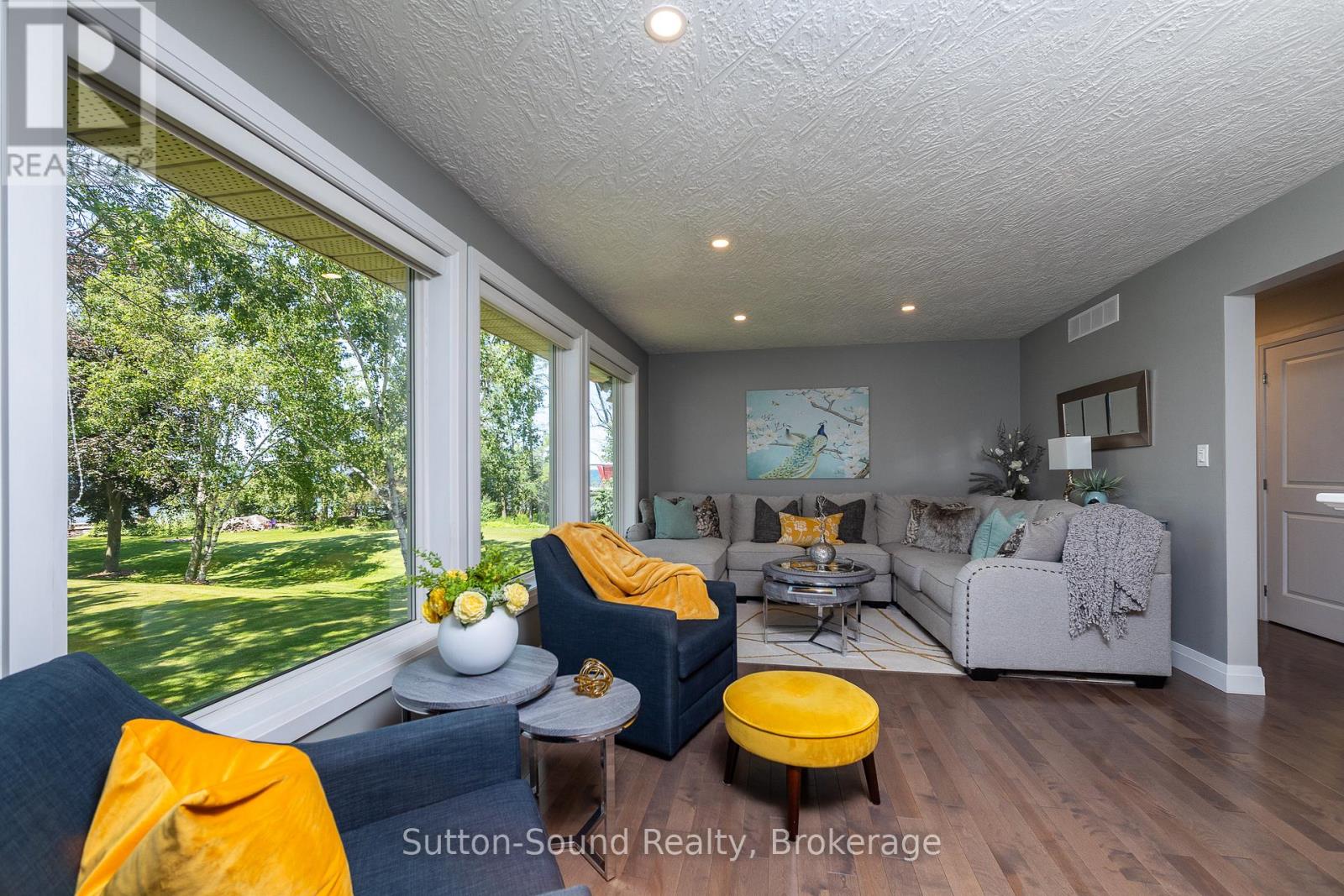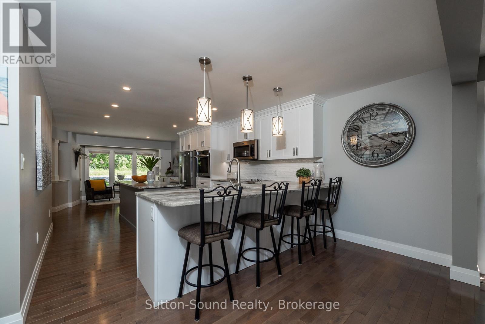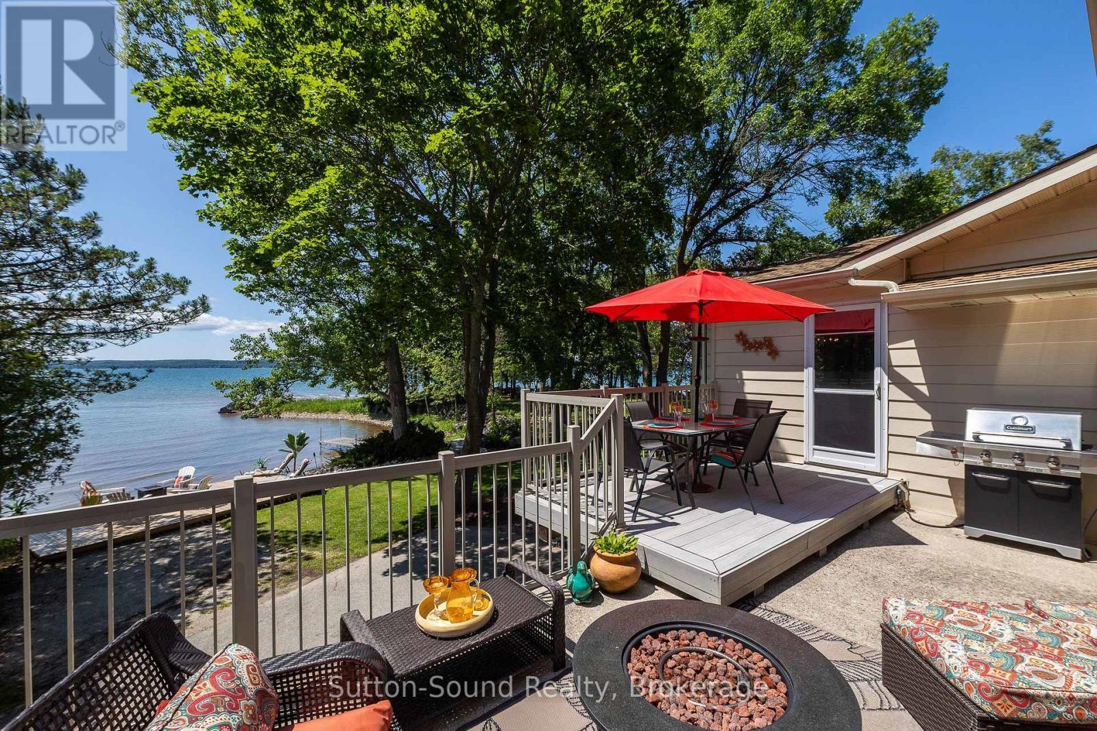 Welcome to 359288 Grey Rd 15, a beautifully updated Georgian Bay waterfront retreat just minutes from Owen Sound. This impeccably maintained 4-bedroom, 3 bathroom bungalow with attached garage offers over 400 ft of pristine shoreline, and is nestled on a sprawling, beautifully landscaped 0.65 acre lot with panoramic views and unforgettable sunsets. Designed with both comfort and sophistication in mind, the main level features a spacious, open concept eat-in kitchen complete with a granite island- ideal for entertaining- flowing seamlessly into a stunning dining room addition with expansive windows that frame the captivating waterfront. The main floor also hosts a powder room, living room with gas fireplace, two generously sized bedrooms and a spa-inspired bathroom showcasing exquisite tilework and glass walk-in shower. Energy-efficient ground source heating ensures year-round comfort. The fully finished lower level, with its own private entrance, offers exceptional versatility- perfect for extended family or guests- featuring a second dine-in kitchen with quartz countertops, a welcoming living room with electric fireplace, two additional bedrooms, and a beautifully appointed 4-pc bath with soaking tub and tiled shower. Step outside and the multiple entertaining areas, a spacious dock, and thoughtfully designed spaces invite you to relax and enjoy the very best of refined waterfront living.