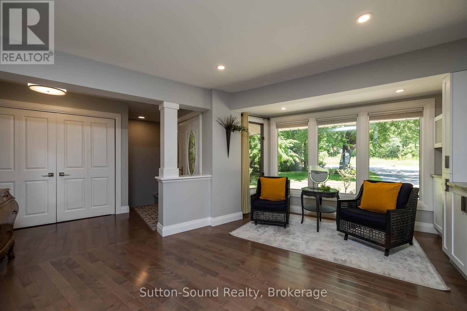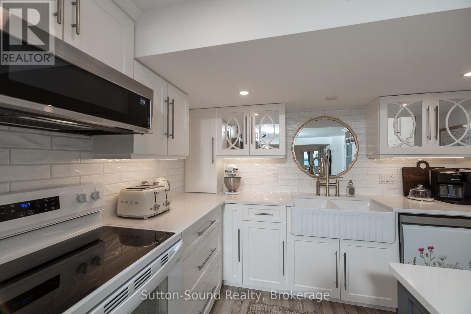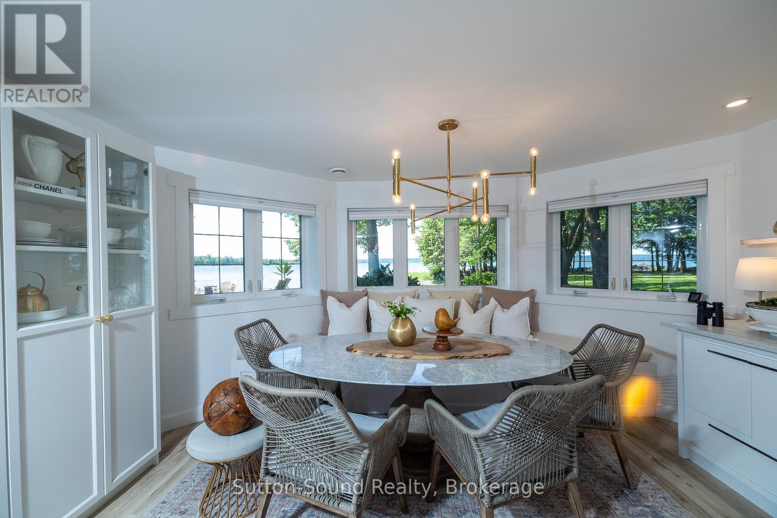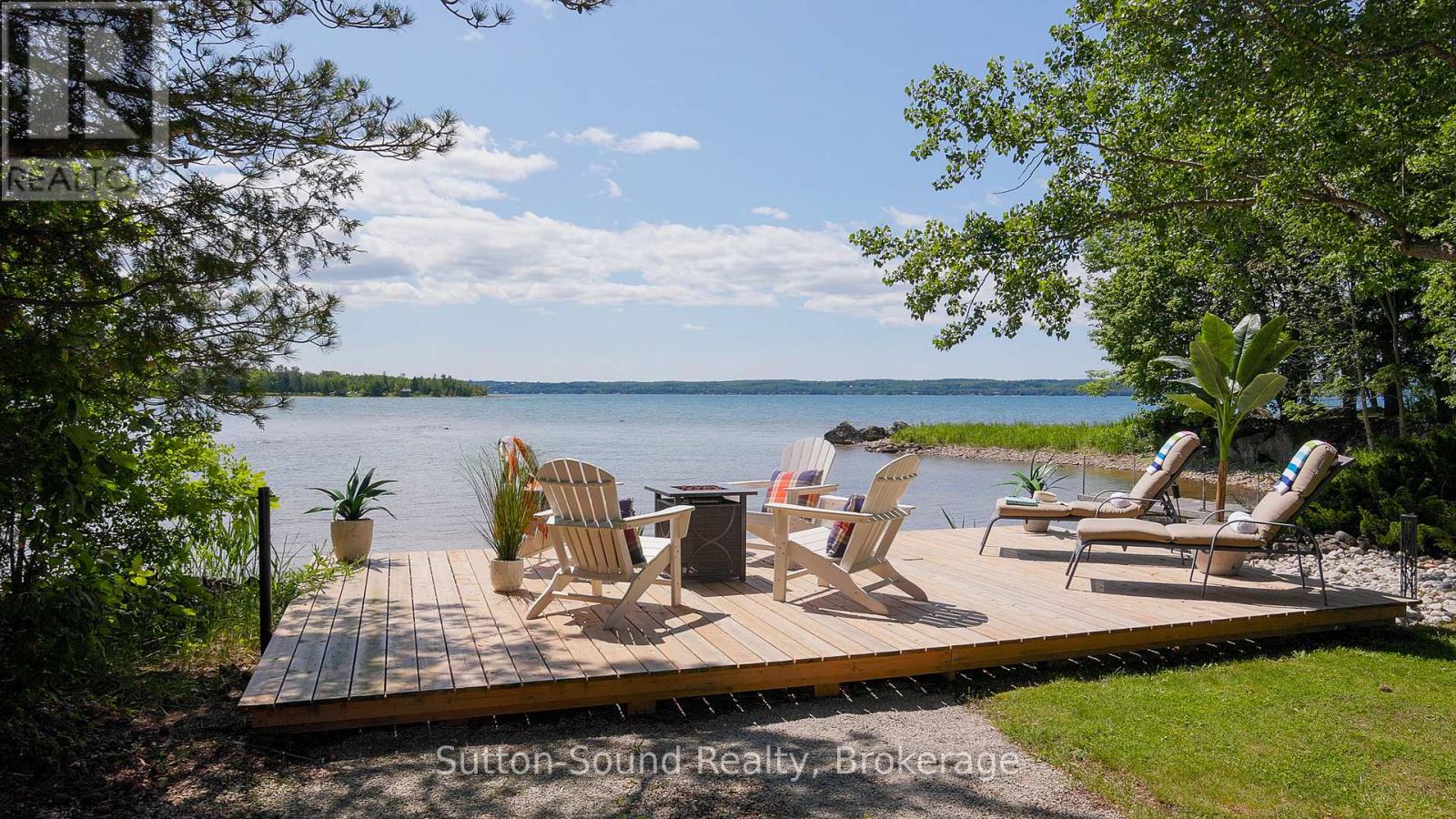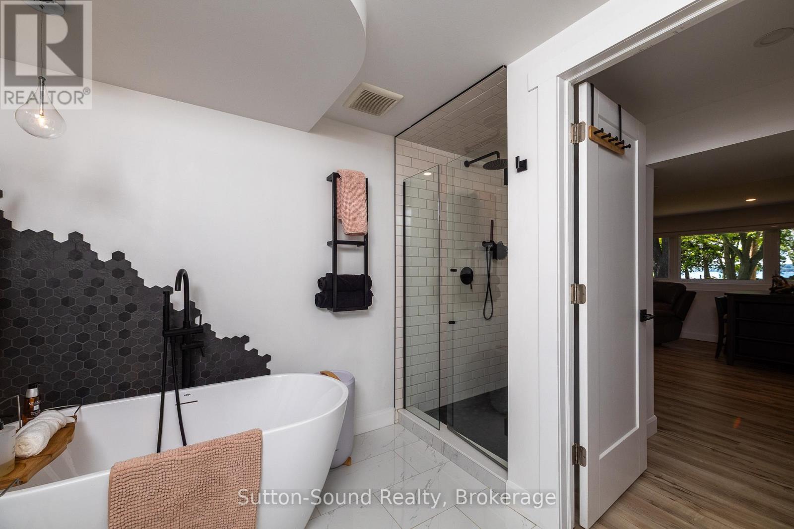 Welcome to 359288 Grey Rd 15, a beautifully updated Georgian Bay waterfront retreat just minutes from Owen Sound. This impeccably maintained 4-bedroom, 3 bathroom bungalow with attached garage offers over 400 ft of pristine shoreline, and is nestled on a sprawling, beautifully landscaped 0.65 acre lot with panoramic views and unforgettable sunsets. Designed with both comfort and sophistication in mind, the main level features a spacious, open concept eat-in kitchen complete with a granite island- ideal for entertaining- flowing seamlessly into a stunning dining room addition with expansive windows that frame the captivating waterfront. The main floor also hosts a powder room, living room with gas fireplace, two generously sized bedrooms and a spa-inspired bathroom showcasing exquisite tilework and glass walk-in shower. Energy-efficient ground source heating ensures year-round comfort. The fully finished lower level, with its own private entrance, offers exceptional versatility- perfect for extended family or guests- featuring a second dine-in kitchen with quartz countertops, a welcoming living room with electric fireplace, two additional bedrooms, and a beautifully appointed 4-pc bath with soaking tub and tiled shower. Step outside and the multiple entertaining areas, a spacious dock, and thoughtfully designed spaces invite you to relax and enjoy the very best of refined waterfront living.